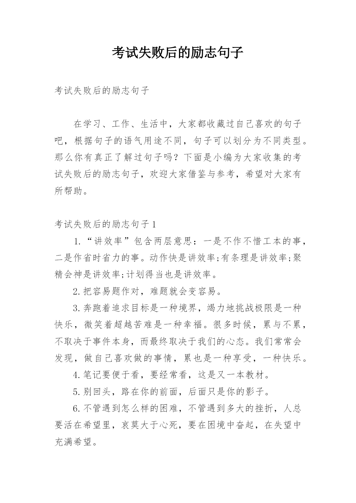 考试失败后的励志句子考试失败后的励志句子在学习、工作、生活中,大家都收藏过自己喜欢的句子吧,根据句子的语气用途不同,句子可以划分为不同类型。那么你有真正了解过句子吗?下面是小编为大家收集的考试失败后的励志句子,欢迎大家借鉴与参考,希望对大家有所帮助。考试失败后的励志句子11.“讲效率”包含两层意思:一是不作不惜工本的事,二是作省时省力的事。动作快是讲效率;有条理是讲效率;聚精会神是讲效率;计划得当也是讲效率。2.把容易题作对,难题就会变容易。3.奔跑着追求目标是一种境界,竭力地挑战极限是一种快乐,微笑着超