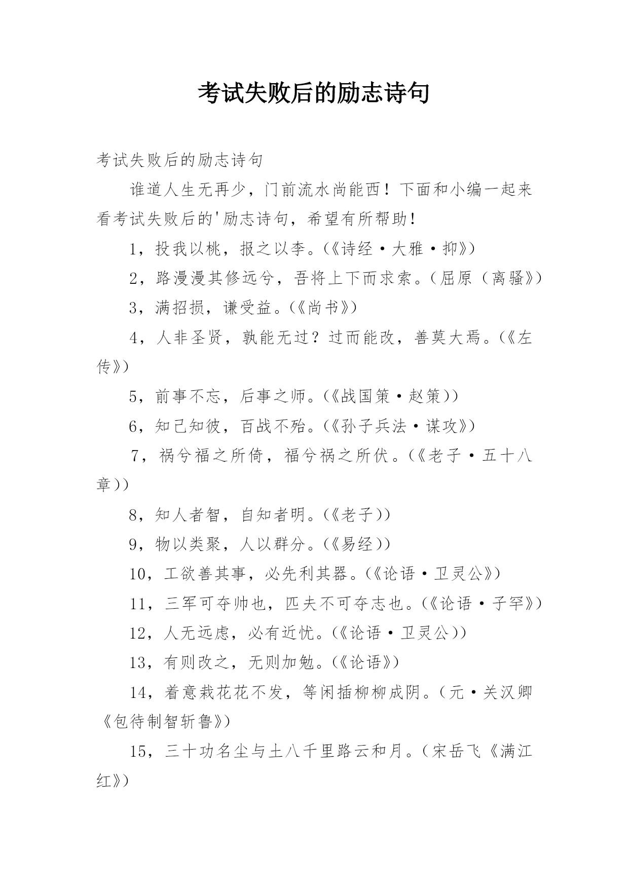 考试失败后的励志诗句考试失败后的励志诗句谁道人生无再少,门前流水尚能西!下面和小编一起来看考试失败后的'励志诗句,希望有所帮助!1,投我以桃,报之以李。(《诗经·大雅·抑》)2,路漫漫其修远兮,吾将上下而求索。(屈原(离骚》)3,满招损,谦受益。(《尚书》)4,人非圣贤,孰能无过?过而能改,善莫大焉。(《左传》)5,前事不忘,后事之师。(《战国策·赵策))6,知己知彼,百战不殆。(《孙子兵法·谋攻》)7,祸兮福之所倚,福兮祸之所伏。(《老子·五十八章))8,知人者智,自知者明。(《老子))9,物以类聚,人