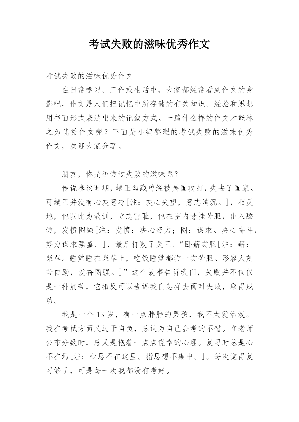 考试失败的滋味优秀作文考试失败的滋味优秀作文在日常学习、工作或生活中,大家都经常看到作文的身影吧,作文是人们把记忆中所存储的有关知识、经验和思想用书面形式表达出来的记叙方式。一篇什么样的作文才能称之为优秀作文呢?下面是小编整理的考试失败的滋味优秀作文,欢迎大家分享。朋友,你是否尝过失败的滋味呢?传说春秋时期,越王勾践曾经被吴国攻打,失去了国家。可越王并没有心灰意冷[注:灰心失望,意志消沉。],相反地,他以此为教训,立志雪耻,他在室内悬挂苦胆,出入舔尝,发愤图强[注:发愤:决心努力;图:谋求。决心奋斗,努力