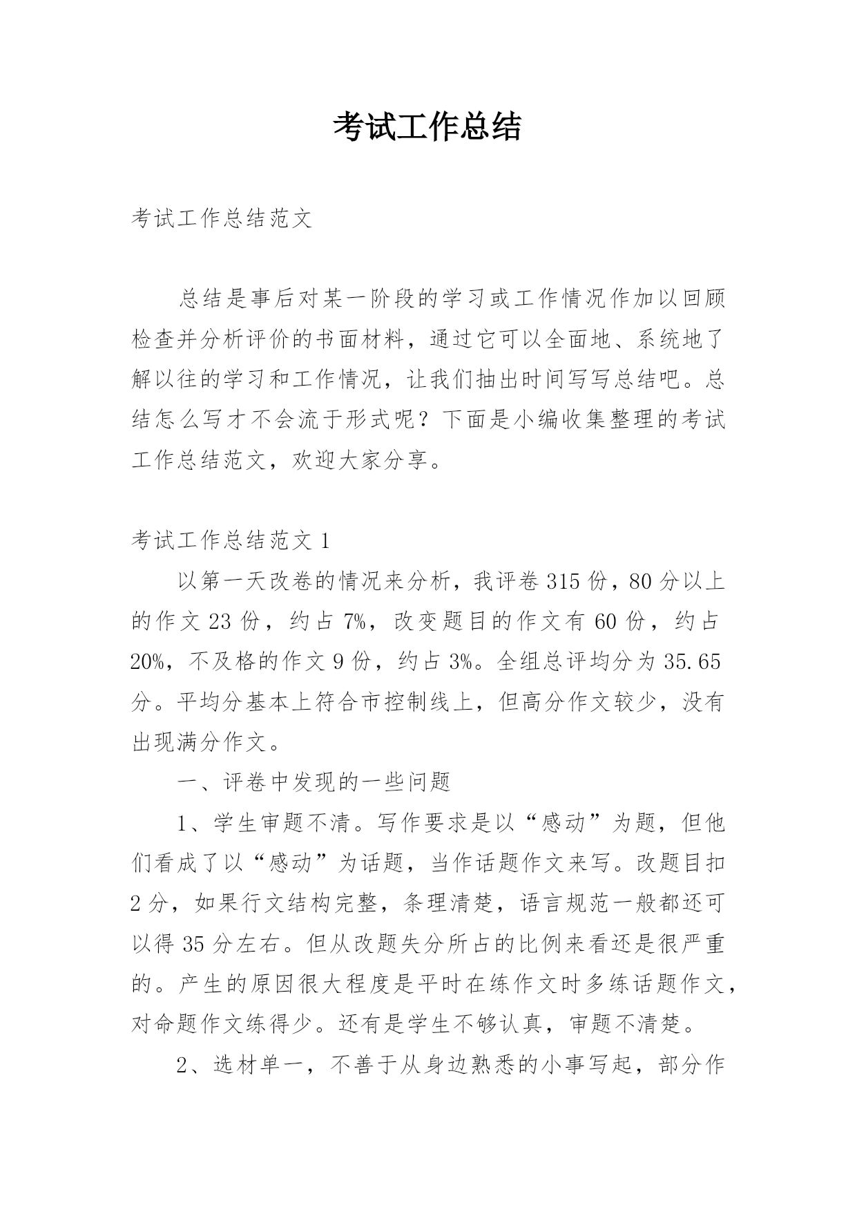 考试工作总结考试工作总结范文总结是事后对某一阶段的学习或工作情况作加以回顾检查并分析评价的书面材料,通过它可以全面地、系统地了解以往的学习和工作情况,让我们抽出时间写写总结吧。总结怎么写才不会流于形式呢?下面是小编收集整理的考试工作总结范文,欢迎大家分享。考试工作总结范文1以第一天改卷的情况来分析,我评卷315份,80分以上的作文23份,约占7%,改变题目的作文有60份,约占20%,不及格的作文9份,约占3%。全组总评均分为35.65分。平均分基本上符合市控制线上,但高分作文较少,没有出现满分作文。一、评