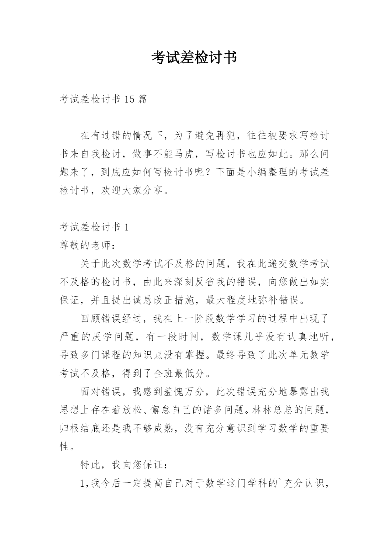 考试差检讨书考试差检讨书15篇在有过错的情况下,为了避免再犯,往往被要求写检讨书来自我检讨,做事不能马虎,写检讨书也应如此。那么问题来了,到底应如何写检讨书呢?下面是小编整理的考试差检讨书,欢迎大家分享。考试差检讨书1尊敬的老师:关于此次数学考试不及格的问题,我在此递交数学考试不及格的检讨书,由此来深刻反省我的错误,向您做出如实保证,并且提出诚恳改正措施,最大程度地弥补错误。回顾错误经过,我在上一阶段数学学习的过程中出现了严重的厌学问题,有一段时间,数学课几乎没有认真地听,导致多门课程的知识点没有掌握。最