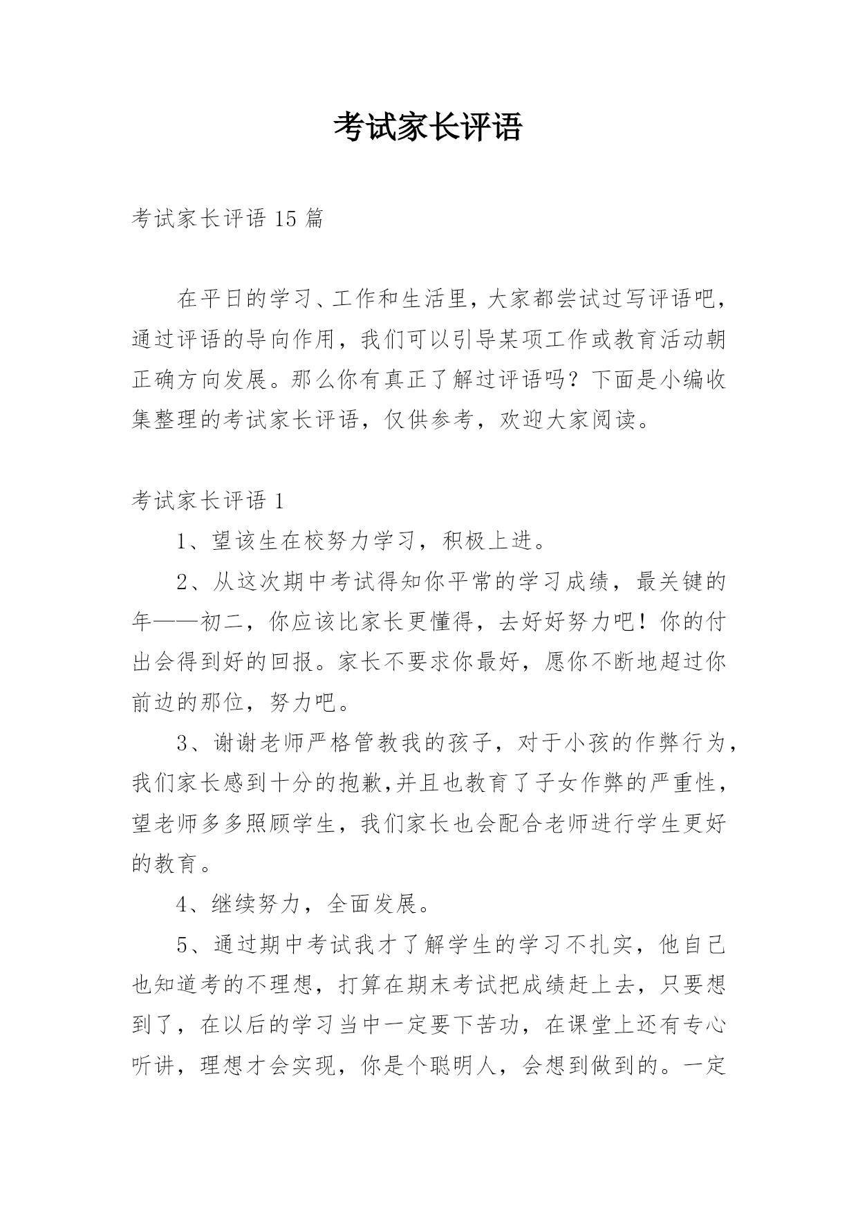 考试家长评语考试家长评语15篇在平日的学习、工作和生活里,大家都尝试过写评语吧,通过评语的导向作用,我们可以引导某项工作或教育活动朝正确方向发展。那么你有真正了解过评语吗?下面是小编收集整理的考试家长评语,仅供参考,欢迎大家阅读。考试家长评语11、望该生在校努力学习,积极上进。2、从这次期中考试得知你平常的学习成绩,最关键的年——初二,你应该比家长更懂得,去好好努力吧!你的付出会得到好的回报。家长不要求你最好,愿你不断地超过你前边的那位,努力吧。3、谢谢老师严格管教我的孩子,对于小孩的作弊行为,我们家长感