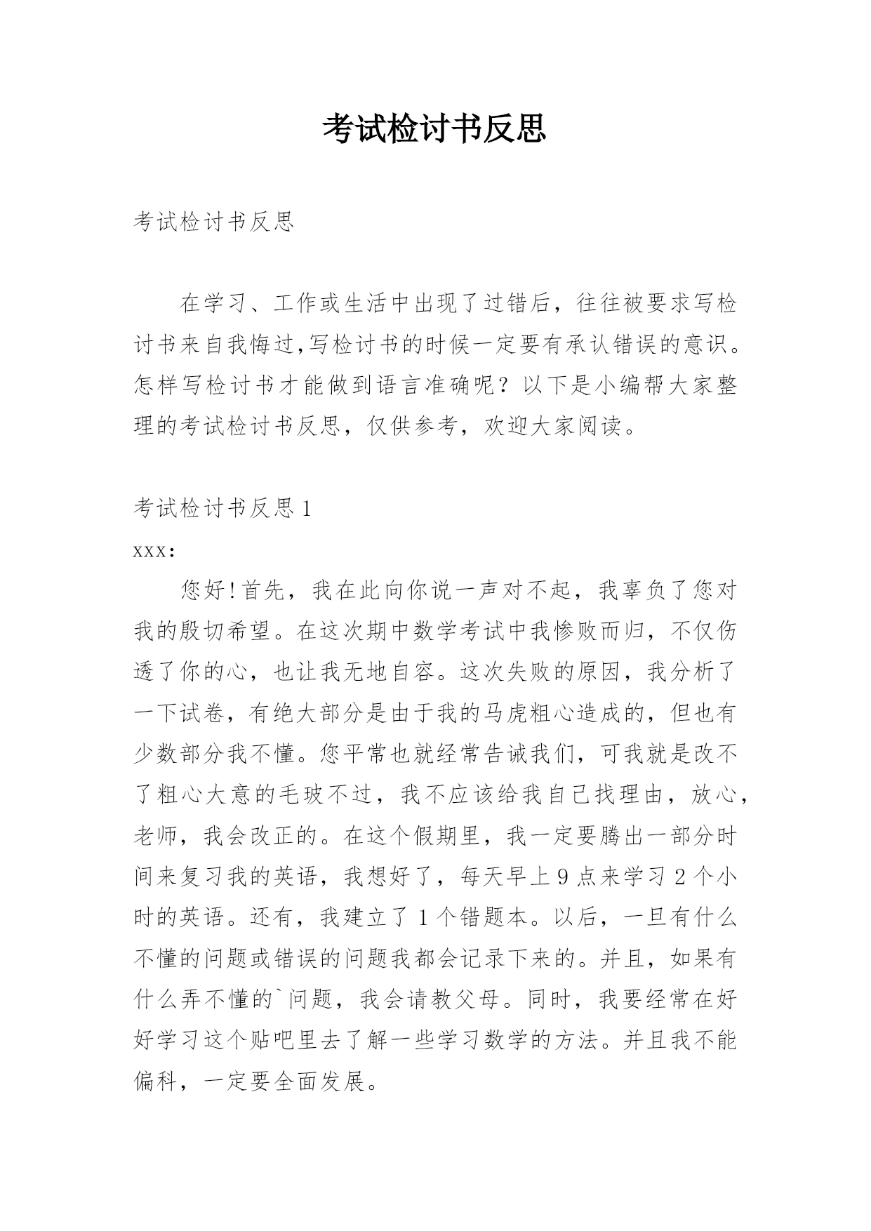 考试检讨书反思考试检讨书反思在学习、工作或生活中出现了过错后,往往被要求写检讨书来自我悔过,写检讨书的时候一定要有承认错误的意识。怎样写检讨书才能做到语言准确呢?以下是小编帮大家整理的考试检讨书反思,仅供参考,欢迎大家阅读。考试检讨书反思1xxx:您好!首先,我在此向你说一声对不起,我辜负了您对我的殷切希望。在这次期中数学考试中我惨败而归,不仅伤透了你的心,也让我无地自容。这次失败的原因,我分析了一下试卷,有绝大部分是由于我的马虎粗心造成的,但也有少数部分我不懂。您平常也就经常告诫我们,可我就是改不了粗心