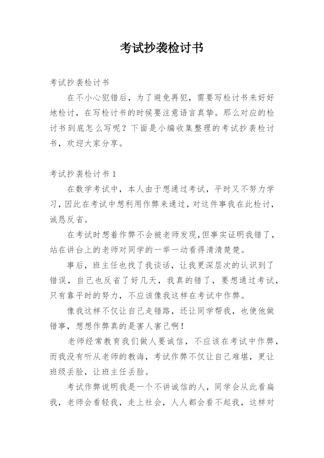 考试抄袭检讨书考试抄袭检讨书在不小心犯错后,为了避免再犯,需要写检讨书来好好地检讨,在写检讨书的时候要注意语言真挚。那么对应的检讨书到底怎么写呢?下面是小编收集整理的考试抄袭检讨书,欢迎大家分享。考试抄袭检讨书1在数学考试中,本人由于想通过考试,平时又不努力学习,因此在考试中想利用作弊来通过,对这件事我在此检讨,诚恳反省。在考试时想着作弊不会被老师发现,但事实证明我错了,站在讲台上的老师对同学的一举一动看得清清楚楚。事后,班主任也找了我谈话,让我更深层次的认识到了错误,自己也反省了好几天,我真的错了,要想