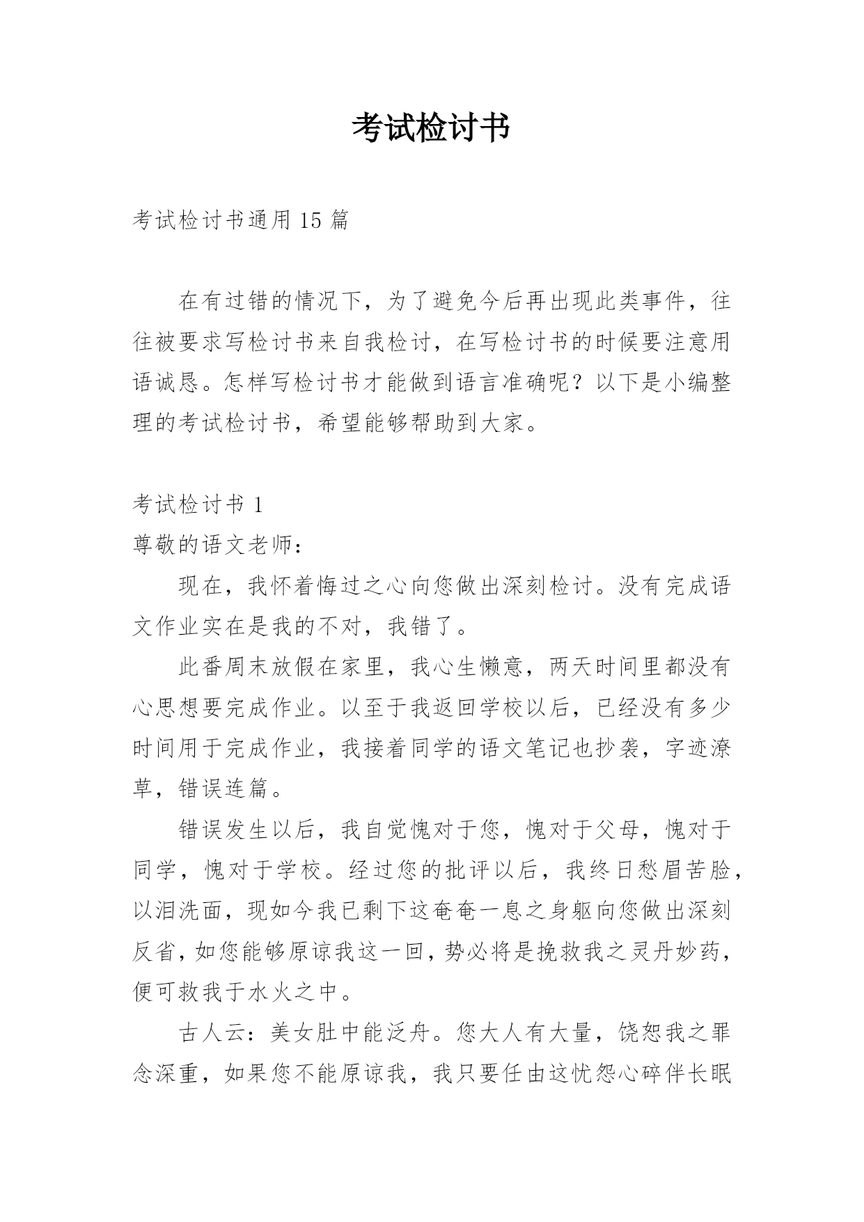 考试检讨书考试检讨书通用15篇在有过错的情况下,为了避免今后再出现此类事件,往往被要求写检讨书来自我检讨,在写检讨书的时候要注意用语诚恳。怎样写检讨书才能做到语言准确呢?以下是小编整理的考试检讨书,希望能够帮助到大家。考试检讨书1尊敬的语文老师:现在,我怀着悔过之心向您做出深刻检讨。没有完成语文作业实在是我的不对,我错了。此番周末放假在家里,我心生懒意,两天时间里都没有心思想要完成作业。以至于我返回学校以后,已经没有多少时间用于完成作业,我接着同学的语文笔记也抄袭,字迹潦草,错误连篇。错误发生以后,我自觉