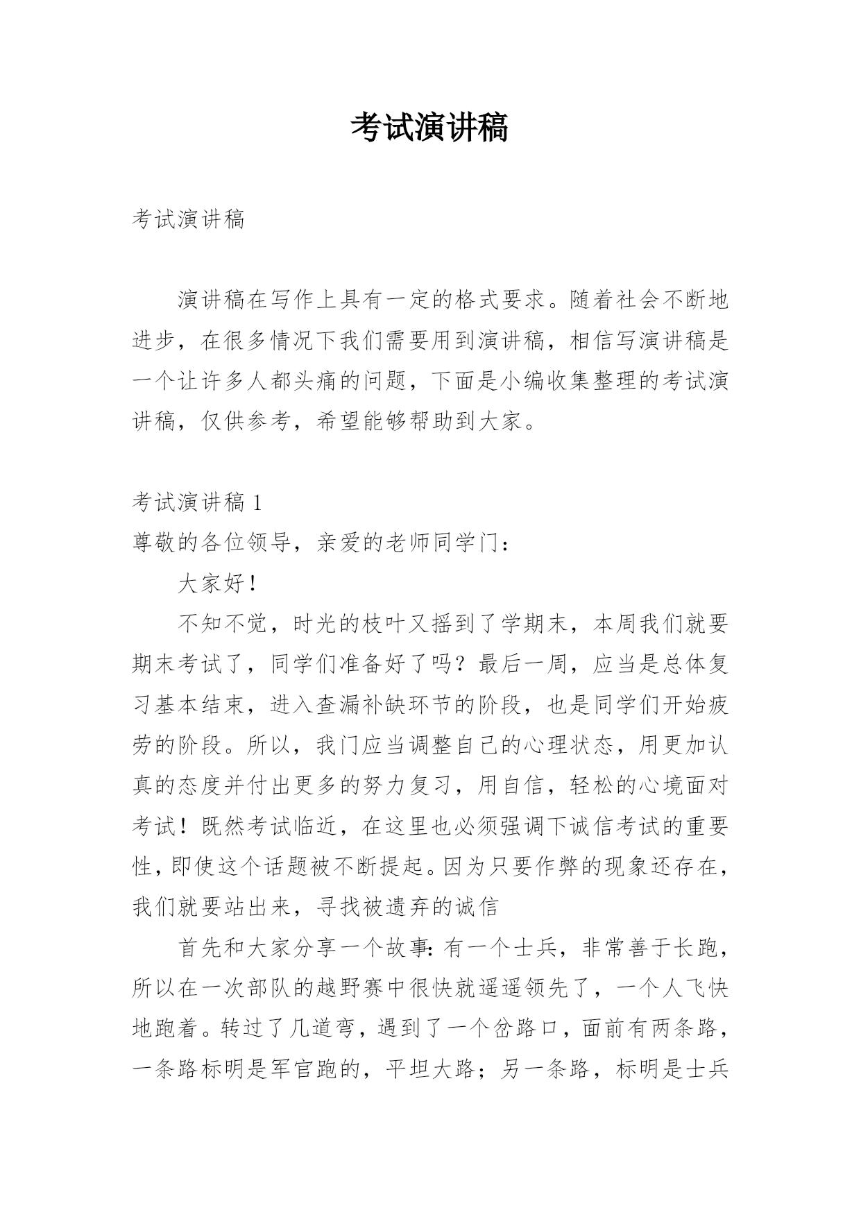 考试演讲稿考试演讲稿演讲稿在写作上具有一定的格式要求。随着社会不断地进步,在很多情况下我们需要用到演讲稿,相信写演讲稿是一个让许多人都头痛的问题,下面是小编收集整理的考试演讲稿,仅供参考,希望能够帮助到大家。考试演讲稿1尊敬的各位领导,亲爱的老师同学门:大家好!不知不觉,时光的枝叶又摇到了学期末,本周我们就要期末考试了,同学们准备好了吗?最后一周,应当是总体复习基本结束,进入查漏补缺环节的阶段,也是同学们开始疲劳的阶段。所以,我门应当调整自己的心理状态,用更加认真的态度并付出更多的努力复习,用自信,轻松的