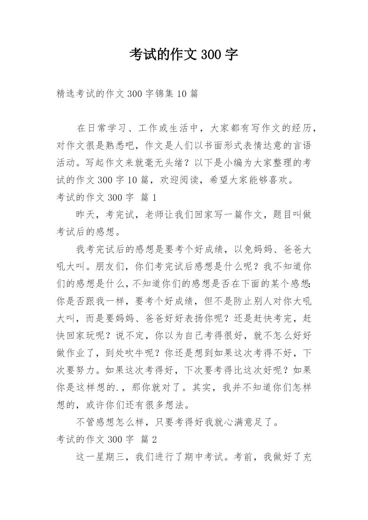 考试的作文300字精选考试的作文300字锦集10篇在日常学习、工作或生活中,大家都有写作文的经历,对作文很是熟悉吧,作文是人们以书面形式表情达意的言语活动。写起作文来就毫无头绪?以下是小编为大家整理的考试的作文300字10篇,欢迎阅读,希望大家能够喜欢。考试的作文300字篇1昨天,考完试,老师让我们回家写一篇作文,题目叫做考试后的感想。我考完试后的感想是要考个好成绩,以免妈妈、爸爸大吼大叫。朋友们,你们考完试后感想是什么呢?我不知道你们的感想是什么,不知道你们的感想是否在下面的某个感想:你是否跟我一样,要