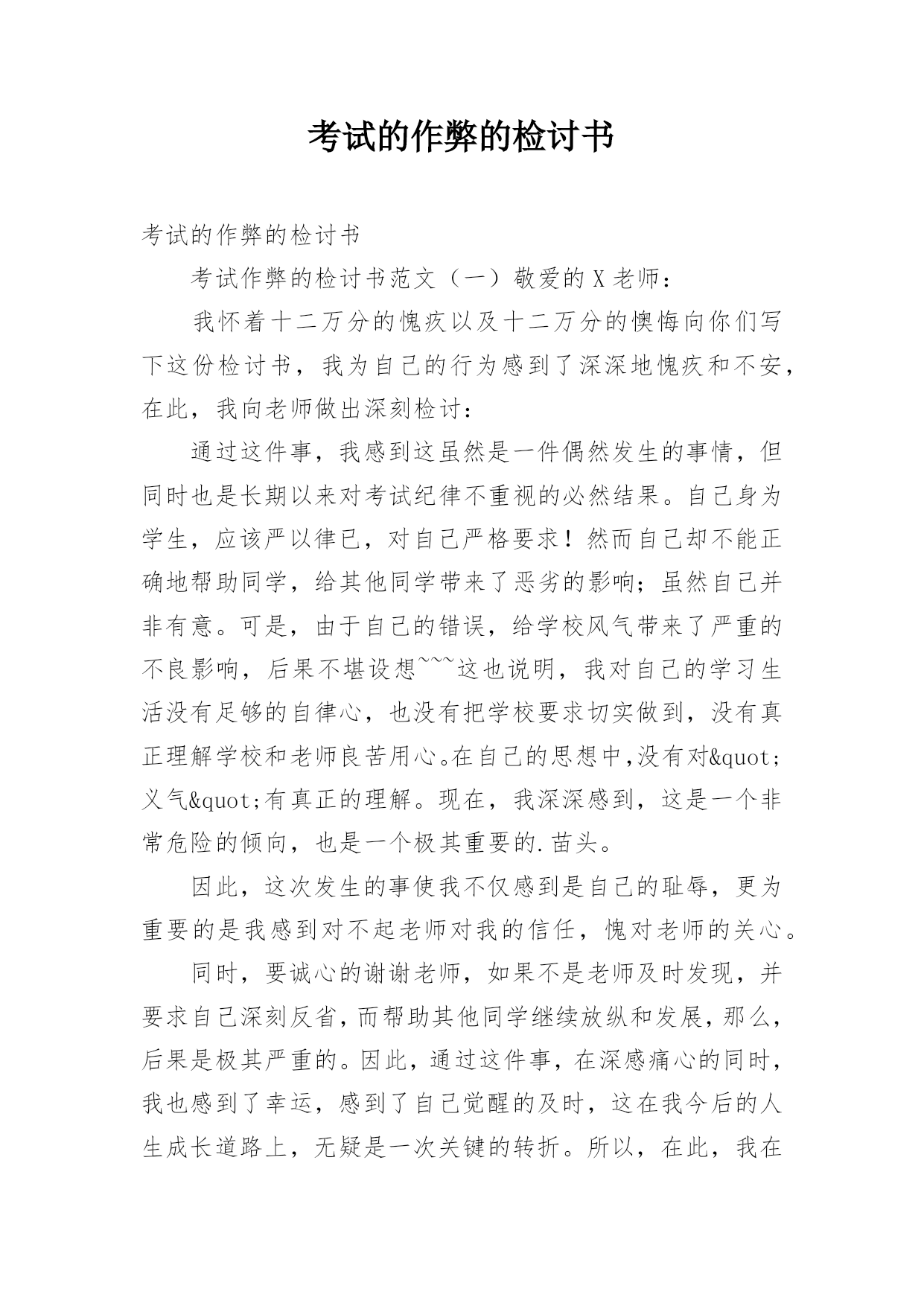 考试的作弊的检讨书考试的作弊的检讨书考试作弊的检讨书范文(一)敬爱的X老师:我怀着十二万分的愧疚以及十二万分的懊悔向你们写下这份检讨书,我为自己的行为感到了深深地愧疚和不安,在此,我向老师做出深刻检讨:通过这件事,我感到这虽然是一件偶然发生的事情,但同时也是长期以来对考试纪律不重视的必然结果。自己身为学生,应该严以律已,对自己严格要求!然而自己却不能正确地帮助同学,给其他同学带来了恶劣的影响;虽然自己并非有意。可是,由于自己的错误,给学校风气带来了严重的不良影响,后果不堪设想~~~这也说明,我对自己的学习