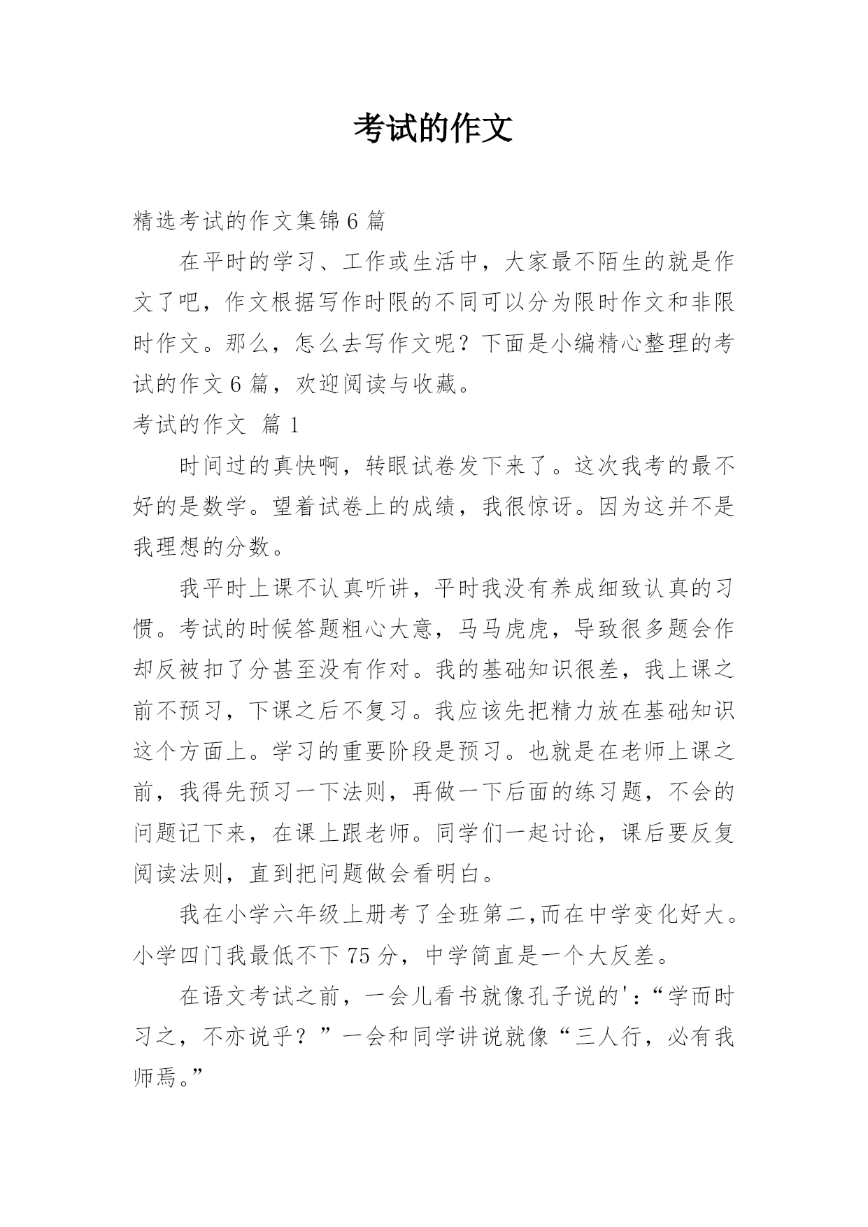 考试的作文精选考试的作文集锦6篇在平时的学习、工作或生活中,大家最不陌生的就是作文了吧,作文根据写作时限的不同可以分为限时作文和非限时作文。那么,怎么去写作文呢?下面是小编精心整理的考试的作文6篇,欢迎阅读与收藏。考试的作文篇1时间过的真快啊,转眼试卷发下来了。这次我考的最不好的是数学。望着试卷上的成绩,我很惊讶。因为这并不是我理想的分数。我平时上课不认真听讲,平时我没有养成细致认真的习惯。考试的时候答题粗心大意,马马虎虎,导致很多题会作却反被扣了分甚至没有作对。我的基础知识很差,我上课之前不预习,下课之