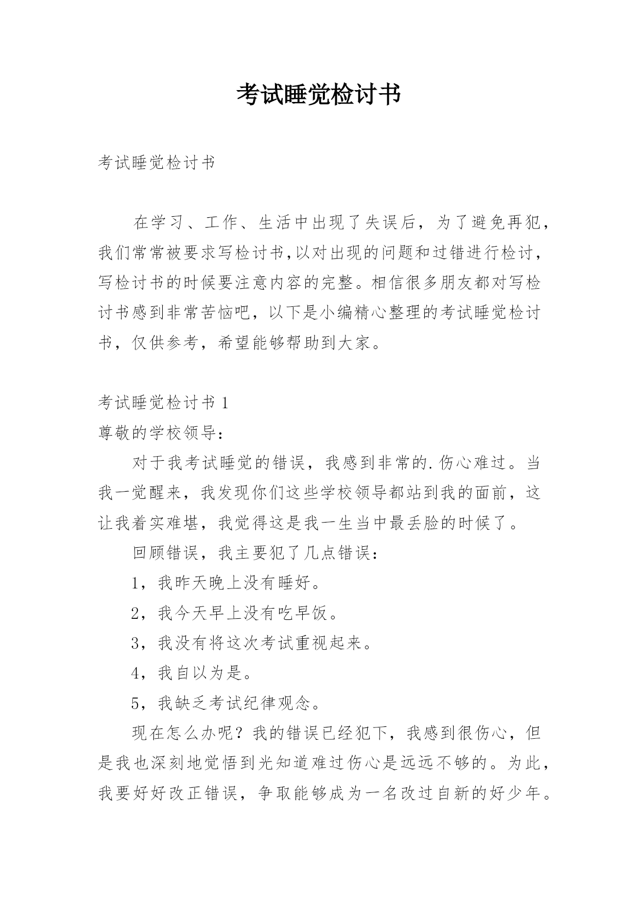 考试睡觉检讨书考试睡觉检讨书在学习、工作、生活中出现了失误后,为了避免再犯,我们常常被要求写检讨书,以对出现的问题和过错进行检讨,写检讨书的时候要注意内容的完整。相信很多朋友都对写检讨书感到非常苦恼吧,以下是小编精心整理的考试睡觉检讨书,仅供参考,希望能够帮助到大家。考试睡觉检讨书1尊敬的学校领导:对于我考试睡觉的错误,我感到非常的.伤心难过。当我一觉醒来,我发现你们这些学校领导都站到我的面前,这让我着实难堪,我觉得这是我一生当中最丢脸的时候了。回顾错误,我主要犯了几点错误:1,我昨天晚上没有睡好。2,我