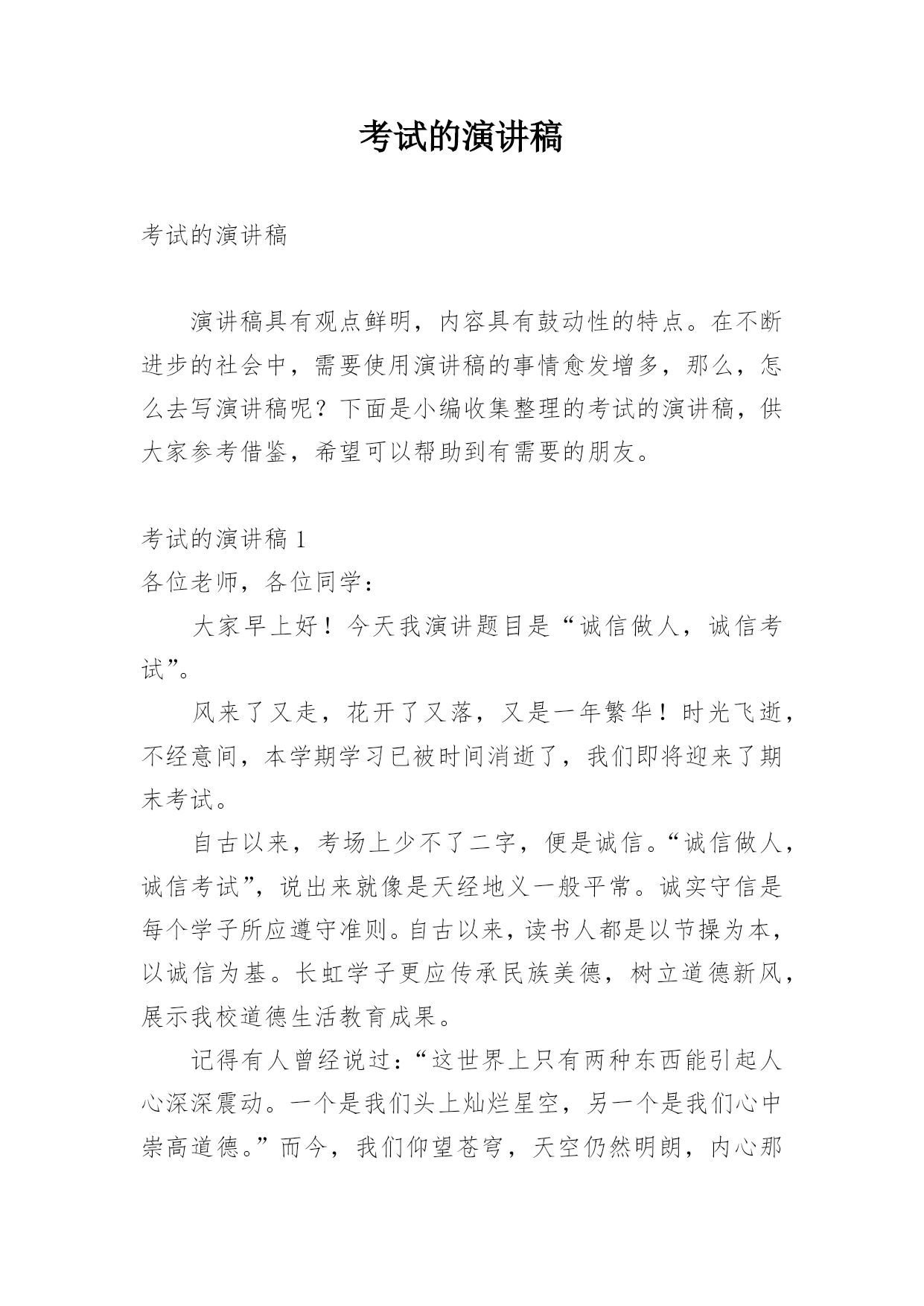 考试的演讲稿考试的演讲稿演讲稿具有观点鲜明,内容具有鼓动性的特点。在不断进步的社会中,需要使用演讲稿的事情愈发增多,那么,怎么去写演讲稿呢?下面是小编收集整理的考试的演讲稿,供大家参考借鉴,希望可以帮助到有需要的朋友。考试的演讲稿1各位老师,各位同学:大家早上好!今天我演讲题目是“诚信做人,诚信考试”。风来了又走,花开了又落,又是一年繁华!时光飞逝,不经意间,本学期学习已被时间消逝了,我们即将迎来了期末考试。自古以来,考场上少不了二字,便是诚信。“诚信做人,诚信考试”,说出来就像是天经地义一般平常。诚实守