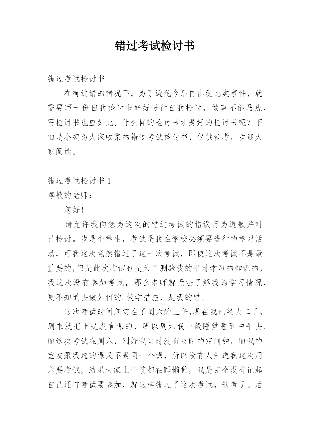 错过考试检讨书错过考试检讨书在有过错的情况下,为了避免今后再出现此类事件,就需要写一份自我检讨书好好进行自我检讨,做事不能马虎,写检讨书也应如此。什么样的检讨书才是好的检讨书呢?下面是小编为大家收集的错过考试检讨书,仅供参考,欢迎大家阅读。错过考试检讨书1尊敬的老师:您好!请允许我向您为这次的错过考试的错误行为道歉并对己检讨。我是个学生,考试是我在学校必须要进行的学习活动,可我这次竟然错过了这一次考试,即使这次考试不是最重要的,但是此次考试也是为了测验我的平时学习的知识的,我这次没有参加考试,那么老师就无
