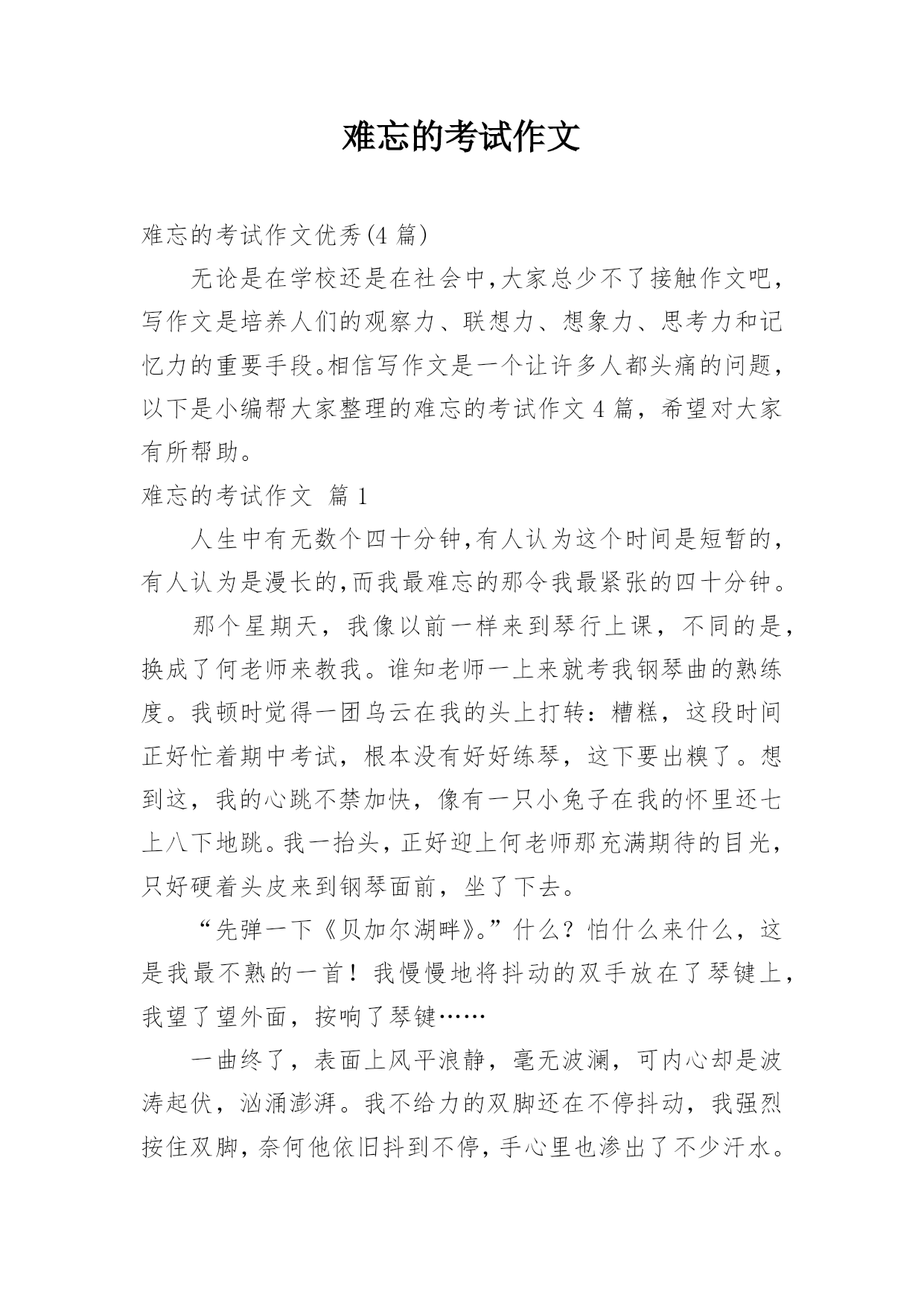 难忘的考试作文难忘的考试作文优秀(4篇)无论是在学校还是在社会中,大家总少不了接触作文吧,写作文是培养人们的观察力、联想力、想象力、思考力和记忆力的重要手段。相信写作文是一个让许多人都头痛的问题,以下是小编帮大家整理的难忘的考试作文4篇,希望对大家有所帮助。难忘的考试作文篇1人生中有无数个四十分钟,有人认为这个时间是短暂的,有人认为是漫长的,而我最难忘的那令我最紧张的四十分钟。那个星期天,我像以前一样来到琴行上课,不同的是,换成了何老师来教我。谁知老师一上来就考我钢琴曲的熟练度。我顿时觉得一团乌云在我的头
