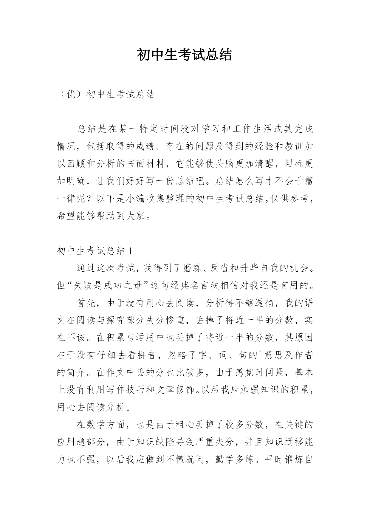 初中生考试总结(优)初中生考试总结总结是在某一特定时间段对学习和工作生活或其完成情况,包括取得的成绩、存在的问题及得到的经验和教训加以回顾和分析的书面材料,它能够使头脑更加清醒,目标更加明确,让我们好好写一份总结吧。总结怎么写才不会千篇一律呢?以下是小编收集整理的初中生考试总结,仅供参考,希望能够帮助到大家。初中生考试总结1通过这次考试,我得到了磨练、反省和升华自我的机会。但“失败是成功之母”这句经典名言我相信对我还是有用的。首先,由于没有用心去阅读,分析得不够透彻,我的语文在阅读与探究部分失分惨重,丢掉