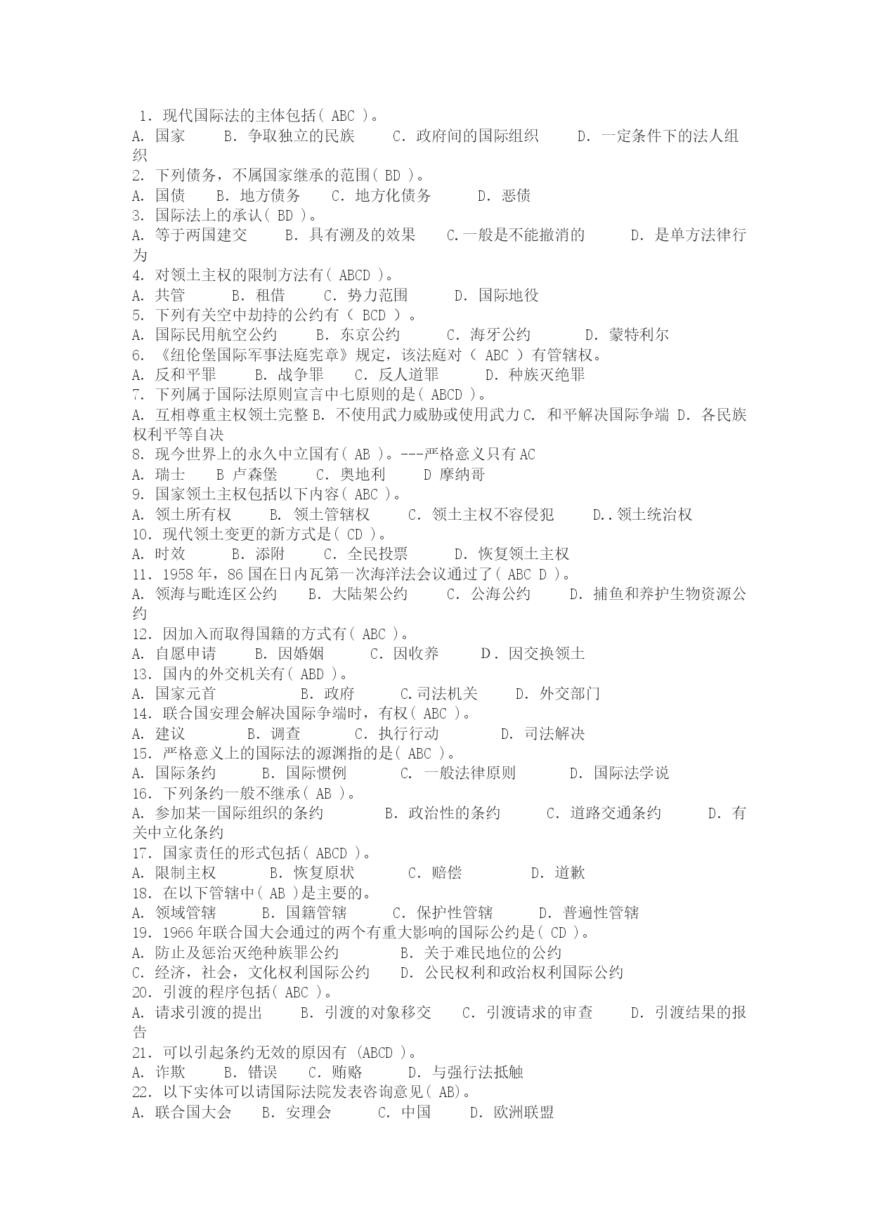 1.现代国际法的主体包括(ABC)。A.国家B.争取独立的民族C.政府间的国际组织D.一定条件下的法人组织2.下列债务,不属国家继承的范围(BD)。A.国债B.地方债务C.地方化债务D.恶债3.国际法上的承认(BD)。A.等于两国建交B.具有溯及的效果C.一般是不能撤消的D.是单方法律行为4.对领土主权的限制方法有(ABCD)。A.共管B.租借C.势力范围D.国际地役5.下列有关空中劫持的公约有(BCD)。A.国际民用航空公约B.东京公约C.海牙公约D.蒙特利尔6.《纽伦堡国际军事法庭宪章》规定,该法庭对