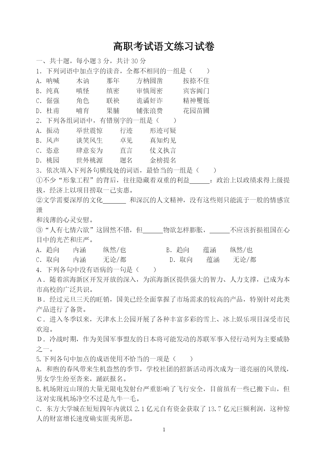 PAGEPAGE9高职考试语文练习试卷一、共十题,每小题3分,共计30分1.下列词语中加点字的读音,全都不相同的一组是()A.呐喊木讷那年方枘圆凿按捺不住B.纯真嗔怪缜密审慎周密宾客阗门C.倔强角色联袂诡谲奸诈精神矍铄D.杜甫哺育果脯铺张浪费花园苗圃2.下列各组词语中,有错别字的一组是()A.振动举世震惊行迹形迹可疑B.风声谈笑风生卓见真知灼见C.恣意肆意妄为直言仗义执言D.桃园世外桃源题名金榜提名3.依次填入下列各句横线处的词语,最恰当的一组是()①不少“形象工程”的背后,往往隐藏着双重的利