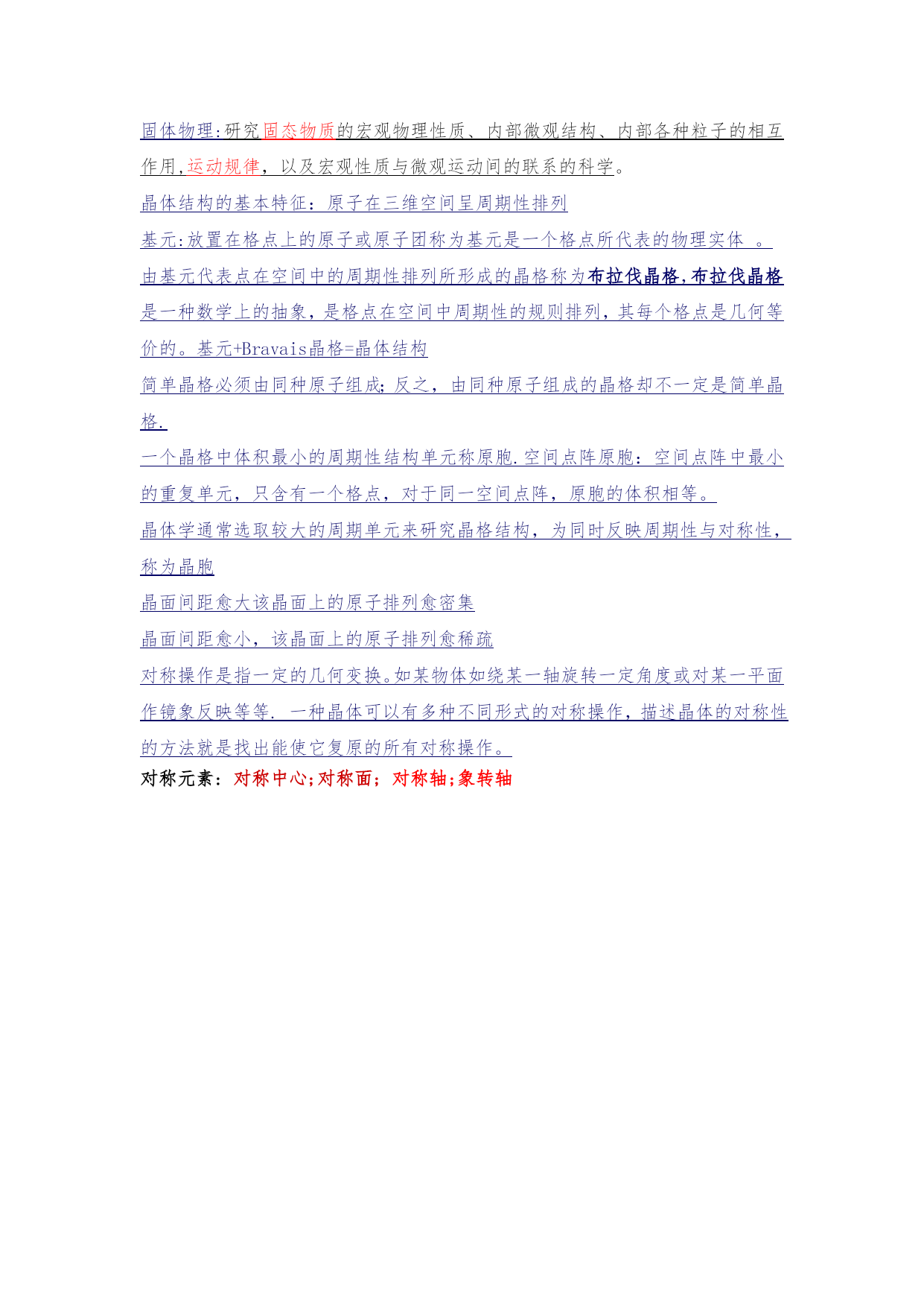 固体物理:研究固态物质的宏观物理性质、内部微观结构、内部各种粒子的相互作用,运动规律,以及宏观性质与微观运动间的联系的科学。晶体结构的基本特征:原子在三维空间呈周期性排列基元:放置在格点上的原子或原子团称为基元是一个格点所代表的物理实体。由基元代表点在空间中的周期性排列所形成的晶格称为布拉伐晶格,布拉伐晶格是一种数学上的抽象,是格点在空间中周期性的规则排列,其每个格点是几何等价的。基元+Bravais晶格=晶体结构简单晶格必须由同种原子组成;反之,由同种原子组成的晶格却不一定是简单晶格.一个晶格中体积最小