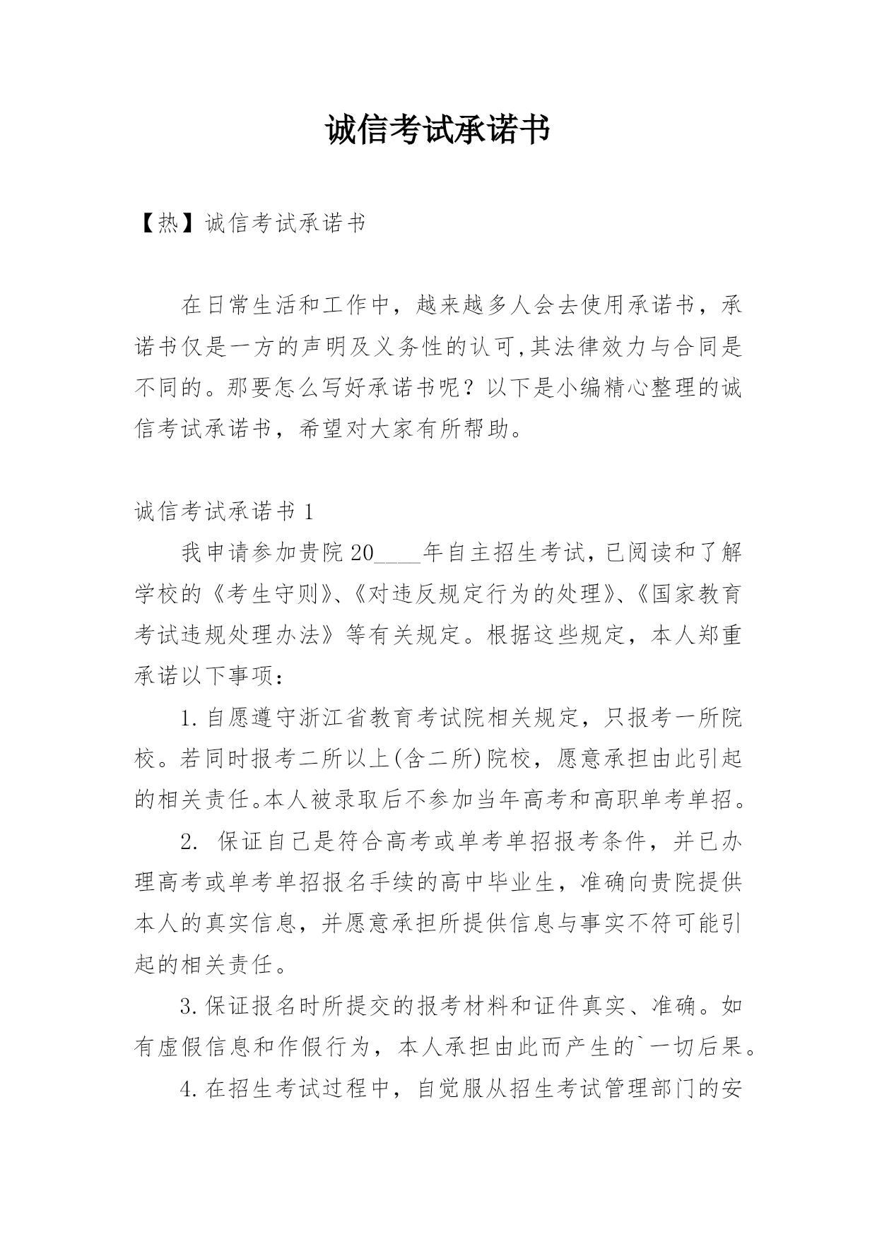 诚信考试承诺书【热】诚信考试承诺书在日常生活和工作中,越来越多人会去使用承诺书,承诺书仅是一方的声明及义务性的认可,其法律效力与合同是不同的。那要怎么写好承诺书呢?以下是小编精心整理的诚信考试承诺书,希望对大家有所帮助。诚信考试承诺书1我申请参加贵院20____年自主招生考试,已阅读和了解学校的《考生守则》、《对违反规定行为的处理》、《国家教育考试违规处理办法》等有关规定。根据这些规定,本人郑重承诺以下事项:1.自愿遵守浙江省教育考试院相关规定,只报考一所院校。若同时报考二所以上(含二所)院校,愿意承担由
