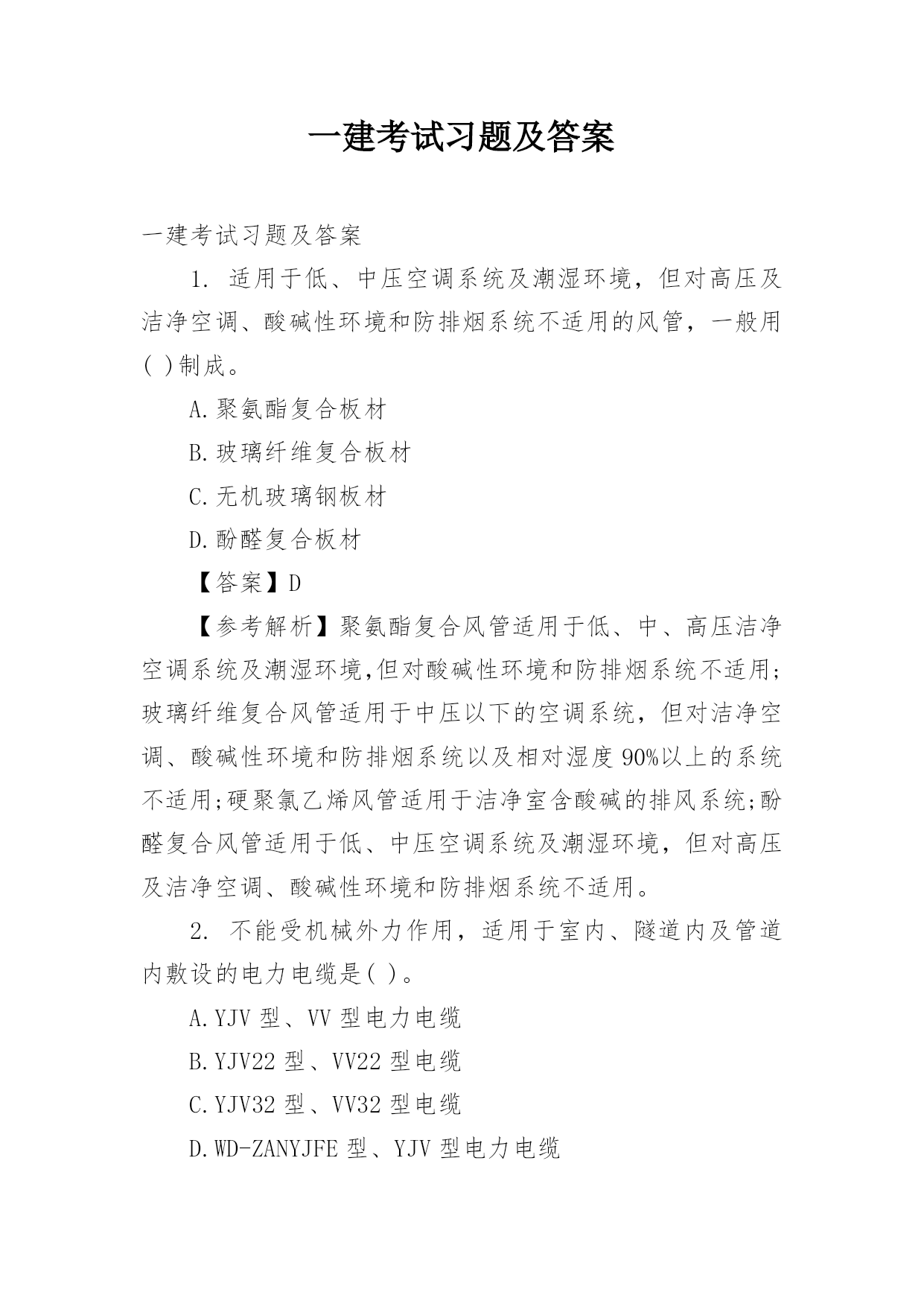一建考试习题及答案一建考试习题及答案1.适用于低、中压空调系统及潮湿环境,但对高压及洁净空调、酸碱性环境和防排烟系统不适用的风管,一般用()制成。A.聚氨酯复合板材B.玻璃纤维复合板材C.无机玻璃钢板材D.酚醛复合板材【答案】D【参考解析】聚氨酯复合风管适用于低、中、高压洁净空调系统及潮湿环境,但对酸碱性环境和防排烟系统不适用;玻璃纤维复合风管适用于中压以下的空调系统,但对洁净空调、酸碱性环境和防排烟系统以及相对湿度90%以上的系统不适用;硬聚氯乙烯风管适用于洁净室含酸碱的排风系统;酚醛复合风管适用于低、
