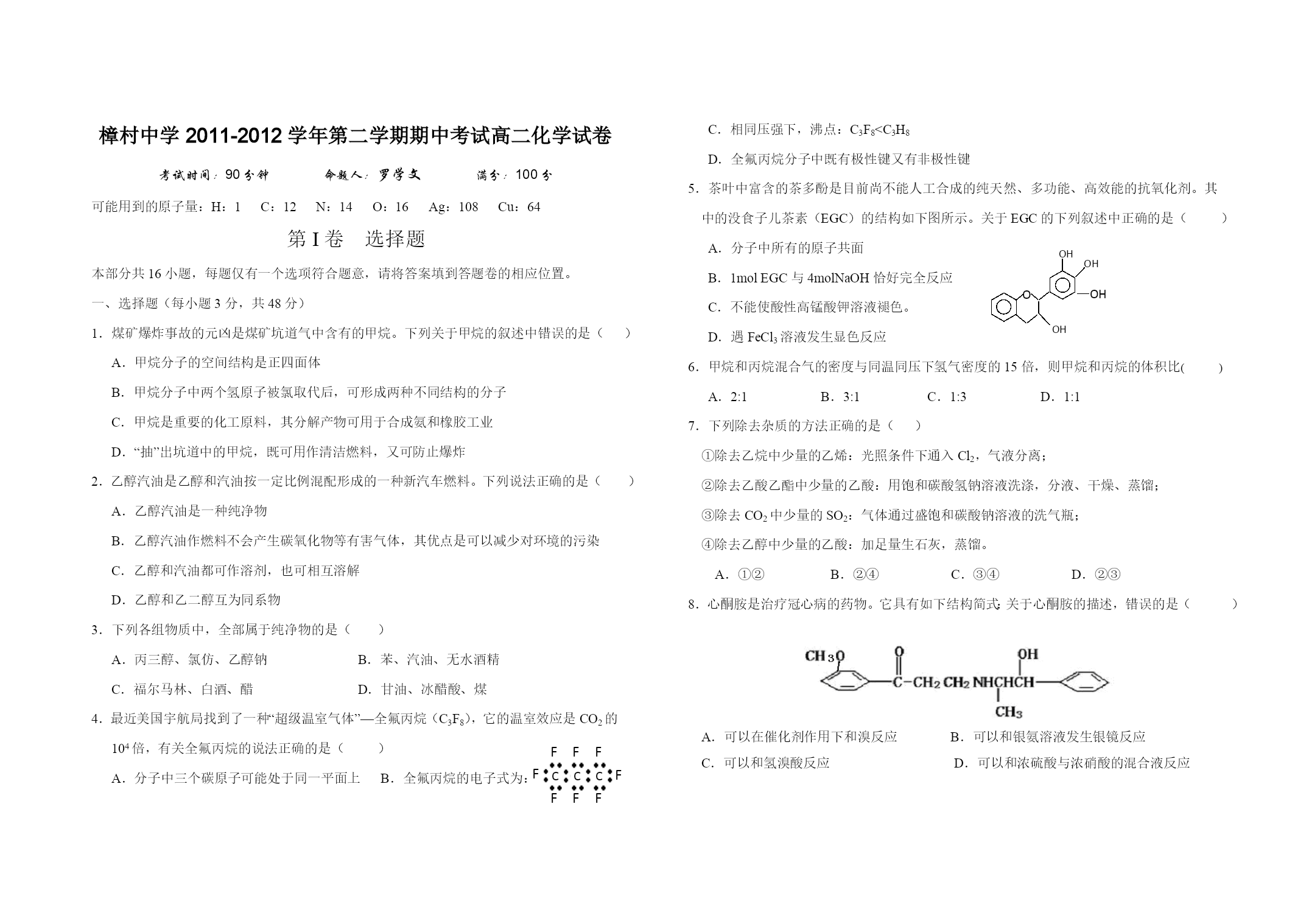 樟村中学2011-2012学年第二学期期中考试高二化学试卷考试时间:90分钟命题人:罗学文满分:100分可能用到的原子量:H:1C:12N:14O:16Ag:108Cu:64第I卷选择题本部分共16小题,每题仅有一个选项符合题意,请将答案填到答题卷的相应位置。一、选择题(每小题3分,共48分)1.煤矿爆炸事故的元凶是煤矿坑道气中含有的甲烷。下列关于甲烷的叙述中错误的是()A.甲烷分子的空间结构是正四面体B.甲烷分子中两个氢原子被氯取代后,可形成两种不同结构的分子C.甲烷是重要的化工原料,其分解产物可用于合