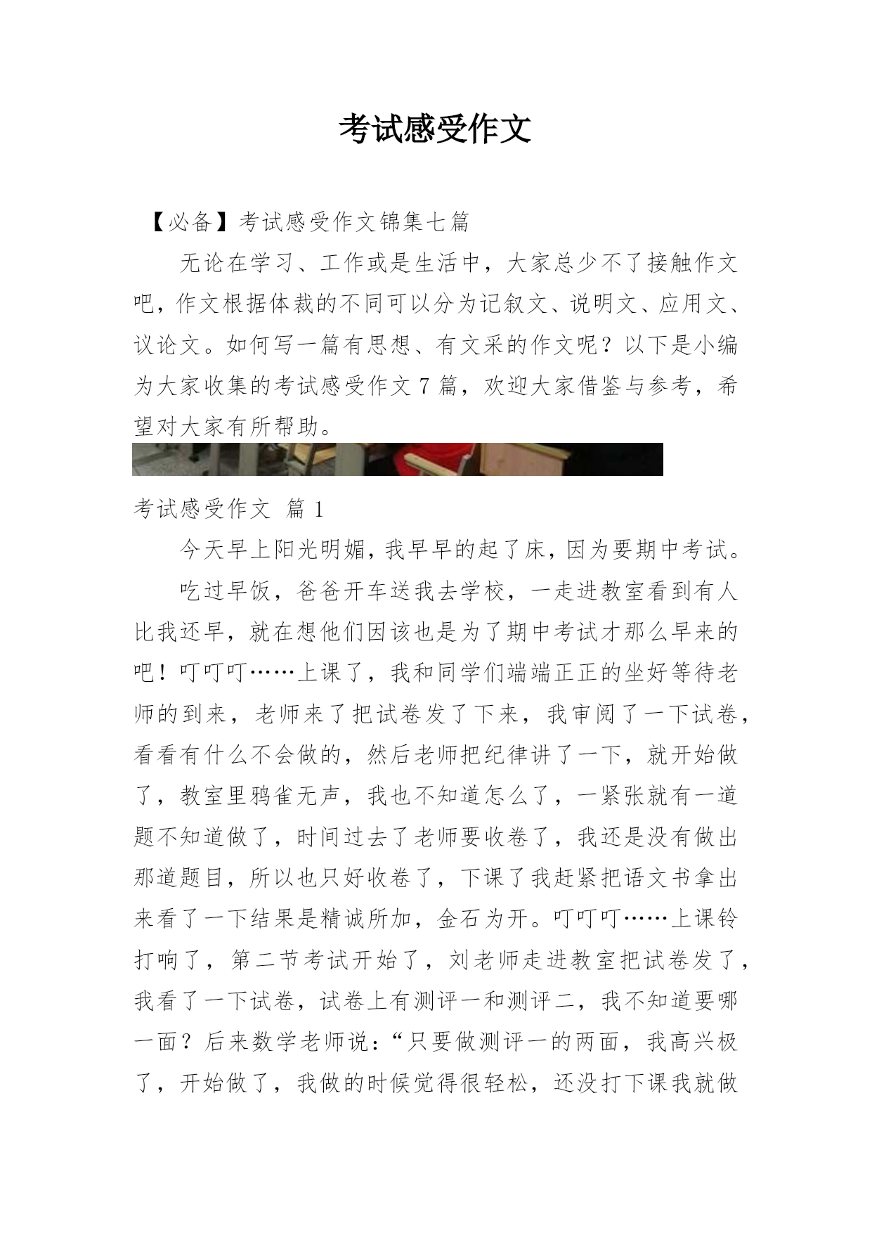 考试感受作文【必备】考试感受作文锦集七篇无论在学习、工作或是生活中,大家总少不了接触作文吧,作文根据体裁的不同可以分为记叙文、说明文、应用文、议论文。如何写一篇有思想、有文采的作文呢?以下是小编为大家收集的考试感受作文7篇,欢迎大家借鉴与参考,希望对大家有所帮助。考试感受作文篇1今天早上阳光明媚,我早早的起了床,因为要期中考试。吃过早饭,爸爸开车送我去学校,一走进教室看到有人比我还早,就在想他们因该也是为了期中考试才那么早来的吧!叮叮叮……上课了,我和同学们端端正正的坐好等待老师的到来,老师来了把试卷发了