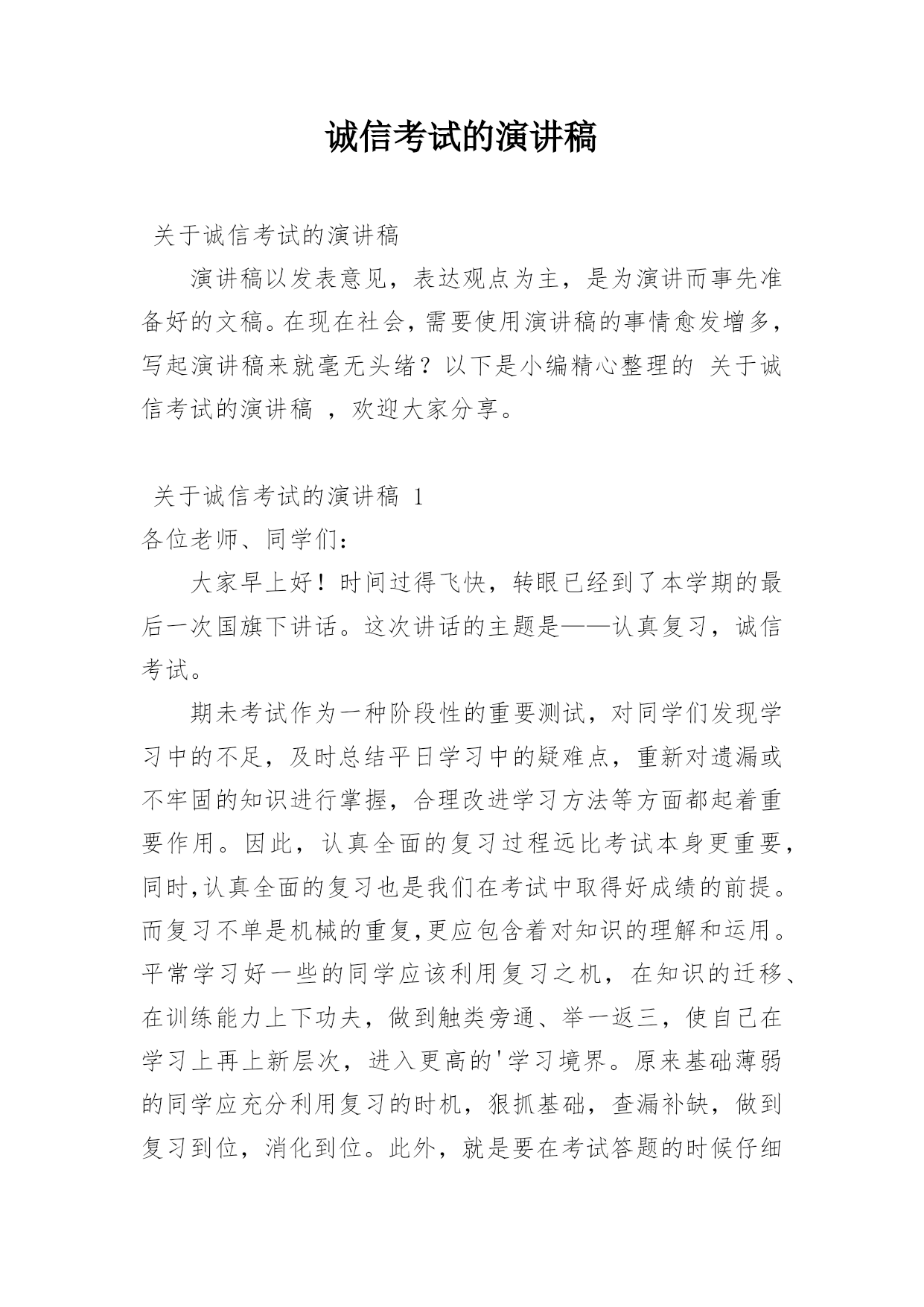 诚信考试的演讲稿关于诚信考试的演讲稿演讲稿以发表意见,表达观点为主,是为演讲而事先准备好的文稿。在现在社会,需要使用演讲稿的事情愈发增多,写起演讲稿来就毫无头绪?以下是小编精心整理的关于诚信考试的演讲稿,欢迎大家分享。关于诚信考试的演讲稿1各位老师、同学们:大家早上好!时间过得飞快,转眼已经到了本学期的最后一次国旗下讲话。这次讲话的主题是——认真复习,诚信考试。期未考试作为一种阶段性的重要测试,对同学们发现学习中的不足,及时总结平日学习中的疑难点,重新对遗漏或不牢固的知识进行掌握,合理改进学习方法等方面都