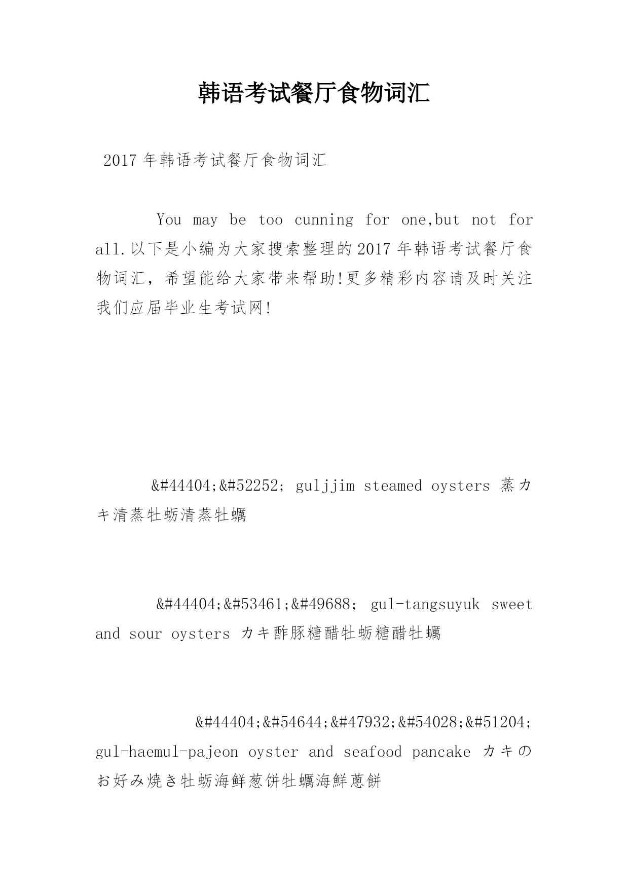 韩语考试餐厅食物词汇2017年韩语考试餐厅食物词汇Youmaybetoocunningforone,butnotforall.以下是小编为大家搜索整理的2017年韩语考试餐厅食物词汇,希望能给大家带来帮助!更多精彩内容请及时关注我们应届毕业生考试网!굴찜guljjimsteamedoysters蒸カキ清蒸牡蛎清蒸牡蠣굴탕수gul-tangsuyuksweetandsouroystersカキ酢豚糖醋牡蛎糖醋牡蠣굴ᕘ