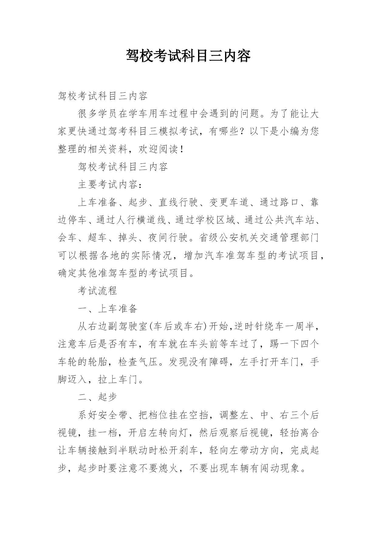 驾校考试科目三内容驾校考试科目三内容很多学员在学车用车过程中会遇到的问题。为了能让大家更快通过驾考科目三模拟考试,有哪些?以下是小编为您整理的相关资料,欢迎阅读!驾校考试科目三内容主要考试内容:上车准备、起步、直线行驶、变更车道、通过路口、靠边停车、通过人行横道线、通过学校区域、通过公共汽车站、会车、超车、掉头、夜间行驶。省级公安机关交通管理部门可以根据各地的实际情况,增加汽车准驾车型的考试项目,确定其他准驾车型的考试项目。考试流程一、上车准备从右边副驾驶室(车后或车右)开始,逆时针绕车一周半,注意车后是