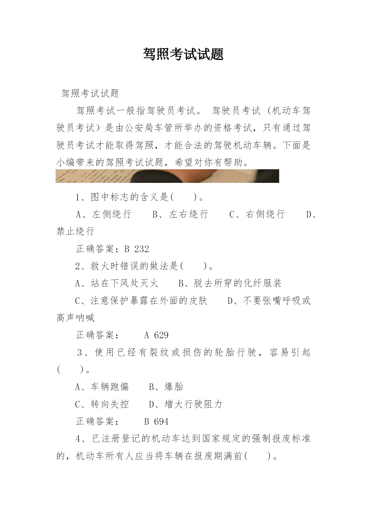 驾照考试试题驾照考试试题驾照考试一般指驾驶员考试。驾驶员考试(机动车驾驶员考试)是由公安局车管所举办的资格考试,只有通过驾驶员考试才能取得驾照,才能合法的驾驶机动车辆。下面是小编带来的驾照考试试题,希望对你有帮助。1、图中标志的含义是()。A、左侧绕行B、左右绕行C、右侧绕行D、禁止绕行正确答案:B2322、救火时错误的做法是()。A、站在下风处灭火B、脱去所穿的化纤服装C、注意保护暴露在外面的皮肤D、不要张嘴呼吸或高声呐喊正确答案:A6293、使用已经有裂纹或损伤的轮胎行驶,容易引起()。A、车辆跑偏B