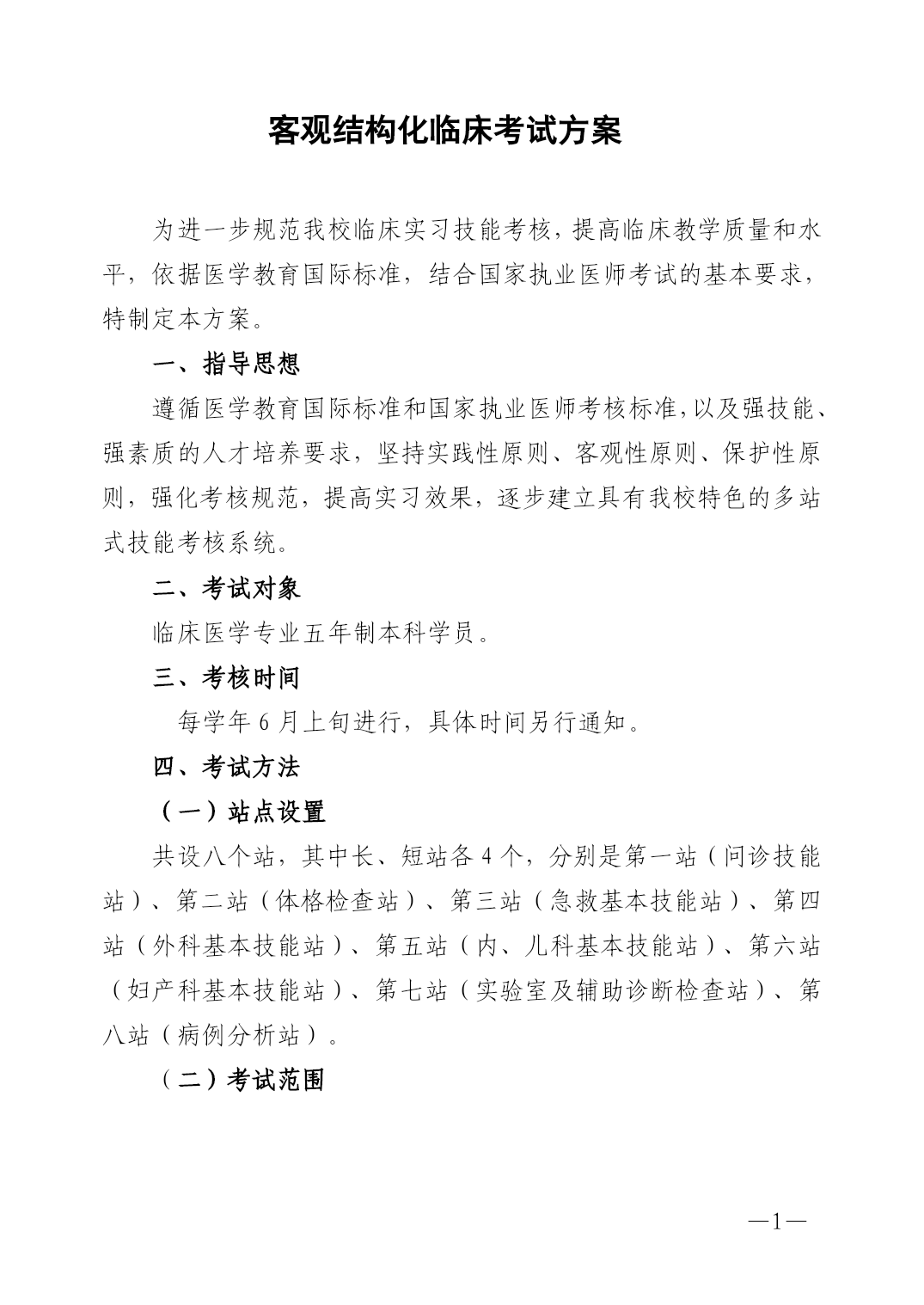 PAGE—PAGE6—客观结构化临床考试方案为进一步规范我校临床实习技能考核,提高临床教学质量和水平,依据医学教育国际标准,结合国家执业医师考试的基本要求,特制定本方案。一、指导思想遵循医学教育国际标准和国家执业医师考核标准,以及强技能、强素质的人才培养要求,坚持实践性原则、客观性原则、保护性原则,强化考核规范,提高实习效果,逐步建立具有我校特色的多站式技能考核系统。二、考试对象临床医学专业五年制本科学员。三、考核时间每学年6月上旬进行,具体时间另行通知。四、考试方法(一)站点设置共设八个站,