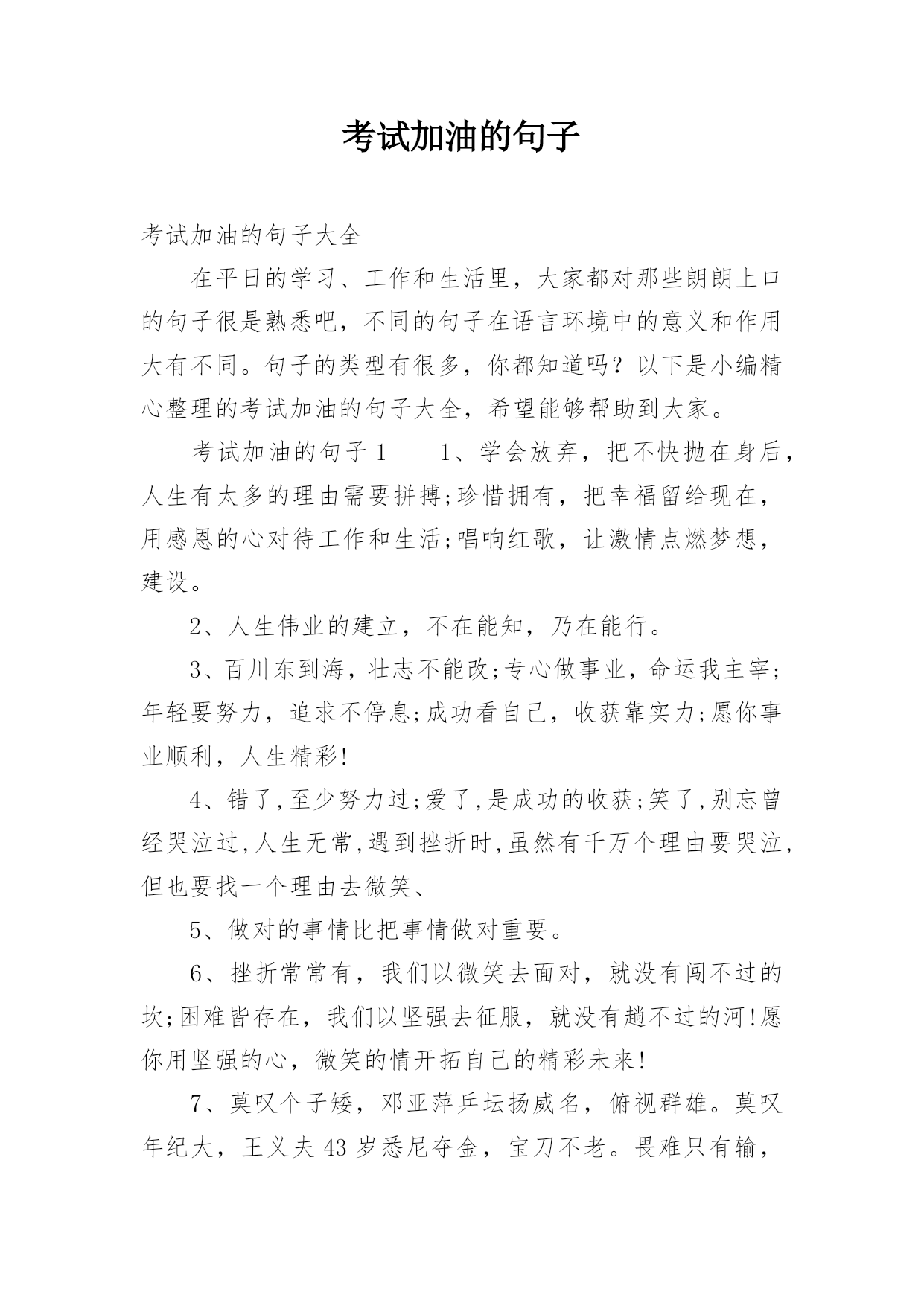 考试加油的句子考试加油的句子大全在平日的学习、工作和生活里,大家都对那些朗朗上口的句子很是熟悉吧,不同的句子在语言环境中的意义和作用大有不同。句子的类型有很多,你都知道吗?以下是小编精心整理的考试加油的句子大全,希望能够帮助到大家。考试加油的句子11、学会放弃,把不快抛在身后,人生有太多的理由需要拼搏;珍惜拥有,把幸福留给现在,用感恩的心对待工作和生活;唱响红歌,让激情点燃梦想,建设。2、人生伟业的建立,不在能知,乃在能行。3、百川东到海,壮志不能改;专心做事业,命运我主宰;年轻要努力,追求不停息;成功看