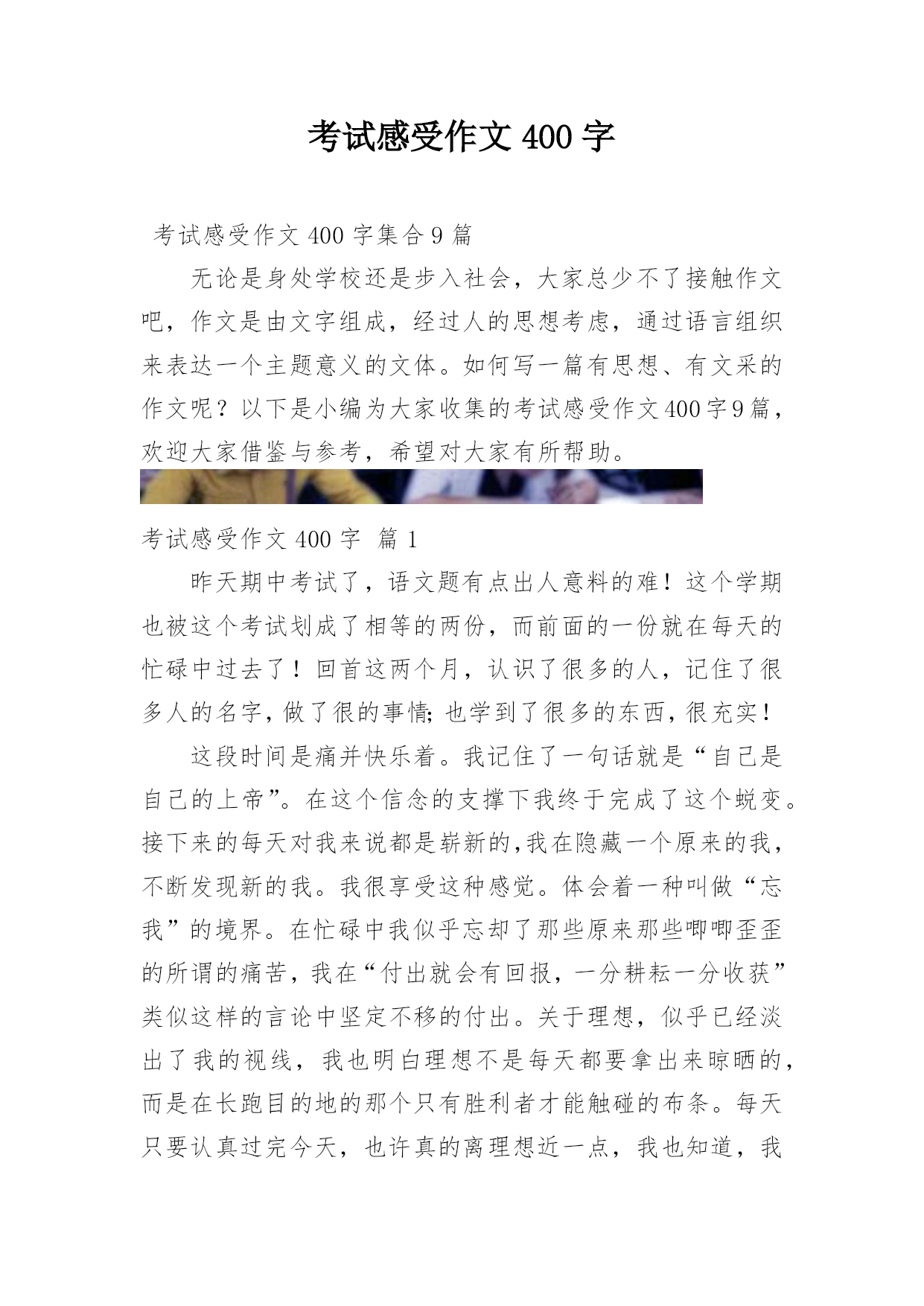 考试感受作文400字考试感受作文400字集合9篇无论是身处学校还是步入社会,大家总少不了接触作文吧,作文是由文字组成,经过人的思想考虑,通过语言组织来表达一个主题意义的文体。如何写一篇有思想、有文采的作文呢?以下是小编为大家收集的考试感受作文400字9篇,欢迎大家借鉴与参考,希望对大家有所帮助。考试感受作文400字篇1昨天期中考试了,语文题有点出人意料的难!这个学期也被这个考试划成了相等的两份,而前面的一份就在每天的忙碌中过去了!回首这两个月,认识了很多的人,记住了很多人的名字,做了很的事情;也学到了很多