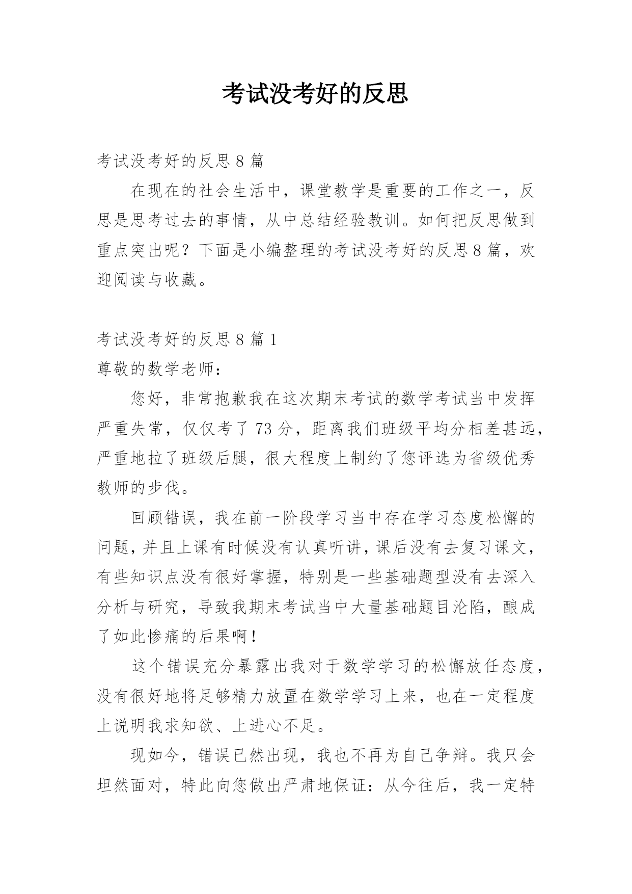考试没考好的反思考试没考好的反思8篇在现在的社会生活中,课堂教学是重要的工作之一,反思是思考过去的事情,从中总结经验教训。如何把反思做到重点突出呢?下面是小编整理的考试没考好的反思8篇,欢迎阅读与收藏。考试没考好的反思8篇1尊敬的数学老师:您好,非常抱歉我在这次期末考试的数学考试当中发挥严重失常,仅仅考了73分,距离我们班级平均分相差甚远,严重地拉了班级后腿,很大程度上制约了您评选为省级优秀教师的步伐。回顾错误,我在前一阶段学习当中存在学习态度松懈的问题,并且上课有时候没有认真听讲,课后没有去复习课文,有