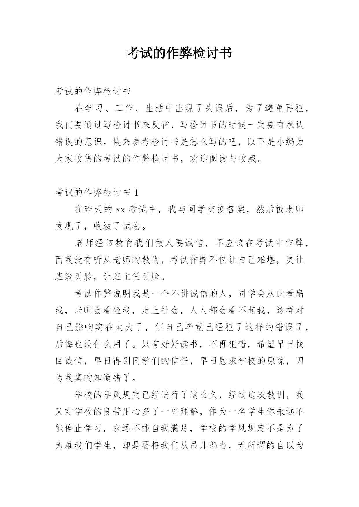考试的作弊检讨书考试的作弊检讨书在学习、工作、生活中出现了失误后,为了避免再犯,我们要通过写检讨书来反省,写检讨书的时候一定要有承认错误的意识。快来参考检讨书是怎么写的吧,以下是小编为大家收集的考试的作弊检讨书,欢迎阅读与收藏。考试的作弊检讨书1在昨天的xx考试中,我与同学交换答案,然后被老师发现了,收缴了试卷。老师经常教育我们做人要诚信,不应该在考试中作弊,而我没有听从老师的教诲,考试作弊不仅让自己难堪,更让班级丢脸,让班主任丢脸。考试作弊说明我是一个不讲诚信的人,同学会从此看扁我,老师会看轻我,走上社