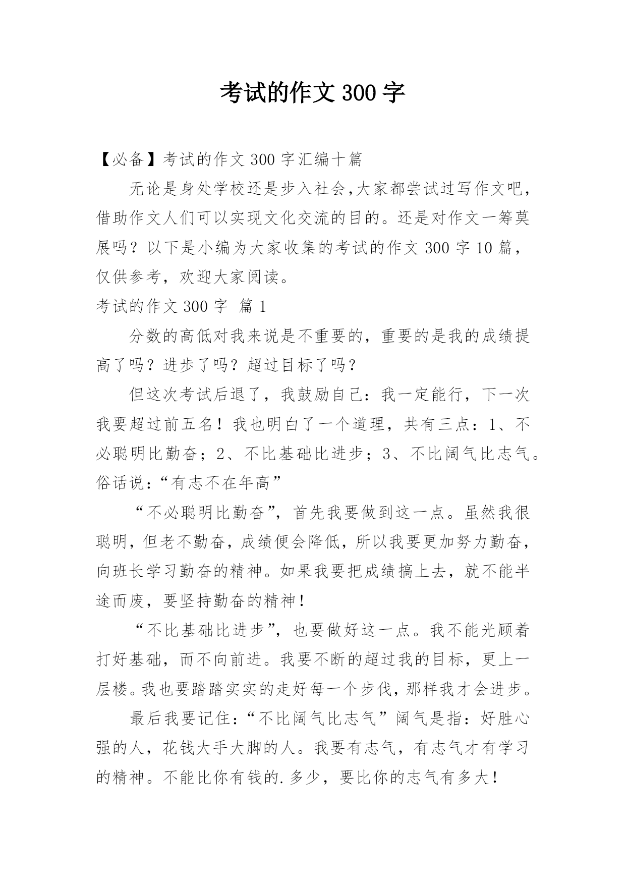考试的作文300字【必备】考试的作文300字汇编十篇无论是身处学校还是步入社会,大家都尝试过写作文吧,借助作文人们可以实现文化交流的目的。还是对作文一筹莫展吗?以下是小编为大家收集的考试的作文300字10篇,仅供参考,欢迎大家阅读。考试的作文300字篇1分数的高低对我来说是不重要的,重要的是我的成绩提高了吗?进歩了吗?超过目标了吗?但这次考试后退了,我鼓励自己:我一定能行,下一次我要超过前五名!我也明白了一个道理,共有三点:1、不必聪明比勤奋;2、不比基础比进步;3、不比阔气比志气。俗话说:“有志不在年高