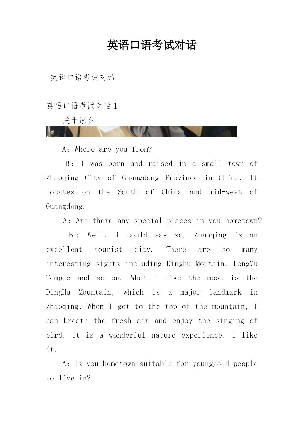 英语口语考试对话英语口语考试对话英语口语考试对话1关于家乡A:Whereareyoufrom?B:IwasbornandraisedinasmalltownofZhaoqingCityofGuangdongProvinceinChina.ItlocatesontheSouthofChinaandmid-westofGuangdong.A:Arethereanyspecialplacesinyouhometown?B:Well,Icouldsayso.Zhaoqingisanexcellenttourist