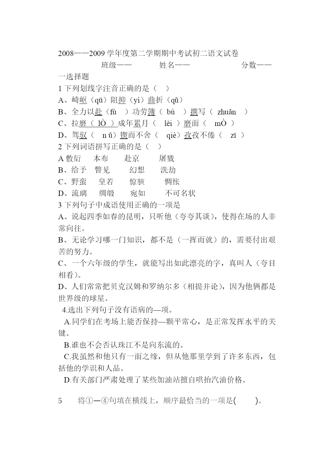 2008——2009学年度第二学期期中考试初二语文试卷班级——姓名——分数——一选择题1下列划线字注音正确的是()A、崎岖(qū)阻抑(yì)曲折(qŭ)B、全力以赴(fù)功劳簿(bù)撰写(zhuăn)C、拉磨(lÒ)成年累月(lěi)磨面(mÒ)D、驾驭(nŭ)锲而不舍(qiè)孜孜不倦(zī)2下列词语拼写正确的是()A敷衍本布赴京屠戮B、给予瞥见幻想洗劫C、野蛮皇若惊骇惆怅D、流璃绸缎宛如不可名状3下列句子中成语使用正确的一项是A、说起四季如春的昆明,只听他(夸夸其谈),使得在场的人非常向往。B