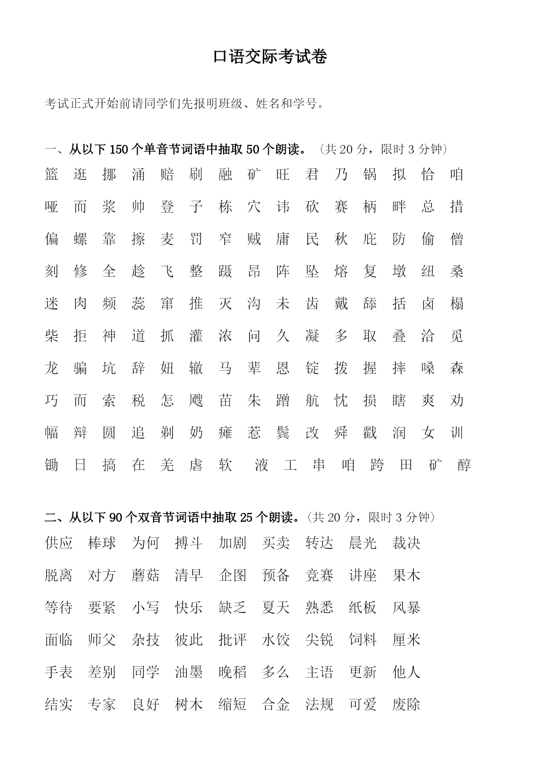 口语交际考试卷考试正式开始前请同学们先报明班级、姓名和学号。从以下150个单音节词语中抽取50个朗读。(共20分,限时3分钟)篮逛挪涌赔刷融矿旺君乃锅拟恰咱哑而浆帅登子栋穴讳砍赛柄畔总措偏螺靠擦麦罚窄贼庸民秋庇防偷僧刻修全趁飞整蹑昂阵坠熔复墩纽桑迷肉频蕊窜推灭沟未齿戴舔括卤榻柴拒神道抓灌浓问久凝多取叠洽觅龙骗坑辞妞辙马辈恩锭拨握摔嗓森巧而索税怎飕苗朱蹭航忱损瞎爽劝幅辩圆追剃奶瘫惹鬓改舜戳润女训锄日搞在羌虐软液工串咱跨田矿醇二、从以下90个双音节词语中抽取25个朗读。(共20分,限时3分钟)供应棒球为何搏斗