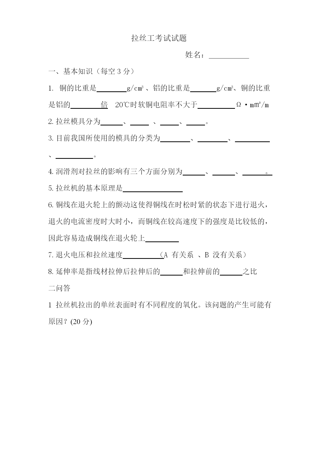 拉丝工考试试题姓名:一、基本知识(每空3分)1.铜的比重是g/cm3、铝的比重是g/cm3、铜的比重是铝的倍20℃时软铜电阻率不大于Ω·m㎡/m2.拉丝模具分为、、、。3.目前我国所使用的模具的分类为、、、。4.润滑剂对拉丝的影响有三个方面分别为、、。5.拉丝机的基本原理是6.铜线在退火轮上的颤动这使得铜线在时松时紧的状态下进行退火,退火的电流密度时大时小,而铜线在较高速度下的强度是比较低的,因此容易造成铜线在退火轮上7.退火电压和拉丝速度(A有关系、B没有关系)8.延伸率是指线材拉伸后拉伸后的和拉伸前的