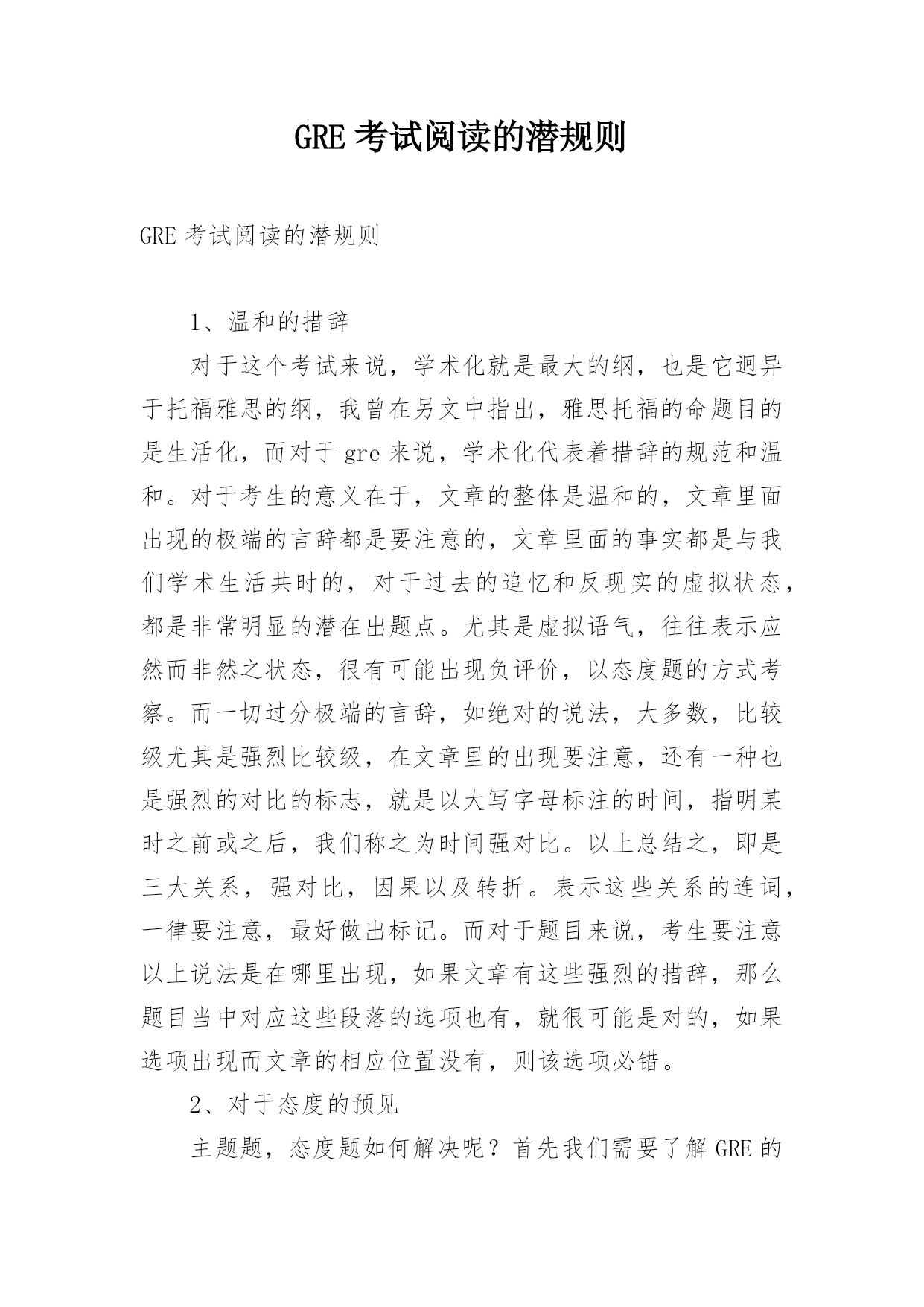 GRE考试阅读的潜规则GRE考试阅读的潜规则1、温和的措辞对于这个考试来说,学术化就是最大的纲,也是它迥异于托福雅思的纲,我曾在另文中指出,雅思托福的命题目的是生活化,而对于gre来说,学术化代表着措辞的规范和温和。对于考生的意义在于,文章的整体是温和的,文章里面出现的极端的言辞都是要注意的,文章里面的事实都是与我们学术生活共时的,对于过去的追忆和反现实的虚拟状态,都是非常明显的潜在出题点。尤其是虚拟语气,往往表示应然而非然之状态,很有可能出现负评价,以态度题的方式考察。而一切过分极端的言辞,如绝对的说法