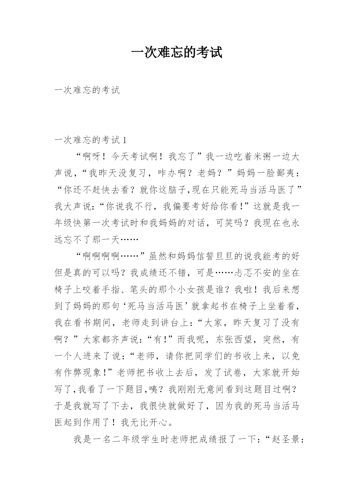 一次难忘的考试一次难忘的考试一次难忘的考试1“啊呀!今天考试啊!我忘了”我一边吃着米粥一边大声说,“我昨天没复习,咋办啊?老妈?”妈妈一脸鄙夷:“你还不赶快去看?就你这脑子,现在只能死马当活马医了”我大声说:“你说我不行,我偏要考好给你看!”这就是我一年级快第一次考试时和我妈妈的对话,可笑吗?我现在也永远忘不了那一天……“啊啊啊啊……”虽然和妈妈信誓旦旦的说我能考的好但是真的可以吗?我成绩还不错,可是……忐忑不安的坐在椅子上咬着手指、笔头的那个小女孩是谁?我啦!我后来想到了妈妈的那句‘死马当活马医’就拿起