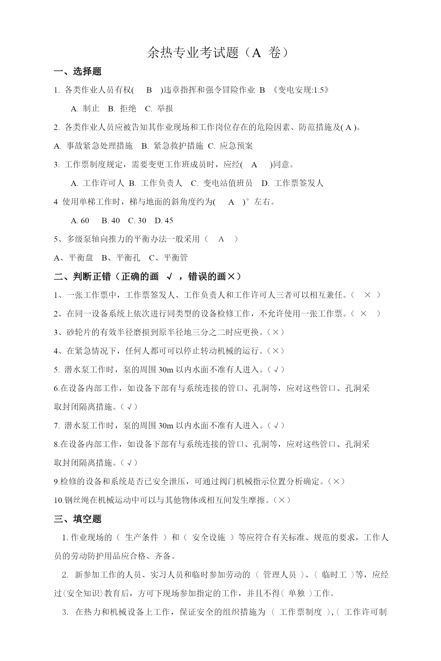 余热专业考试题(A卷)一、选择题1.各类作业人员有权(B)违章指挥和强令冒险作业B《变电安规:1.5》A.制止B.拒绝C.举报2.各类作业人员应被告知其作业现场和工作岗位存在的危险因素、防范措施及(A)。A.事故紧急处理措施B.紧急救护措施C.应急预案3.工作票制度规定,需要变更工作班成员时,应经(A)同意。A.工作许可人B.工作负责人C.变电站值班员D.工作票签发人4使用单梯工作时,梯与地面的斜角度约为(A)°左右。A.60B.40C.30D.455、多级泵轴向推力的平衡办法一般采用(A)A、平衡盘B、