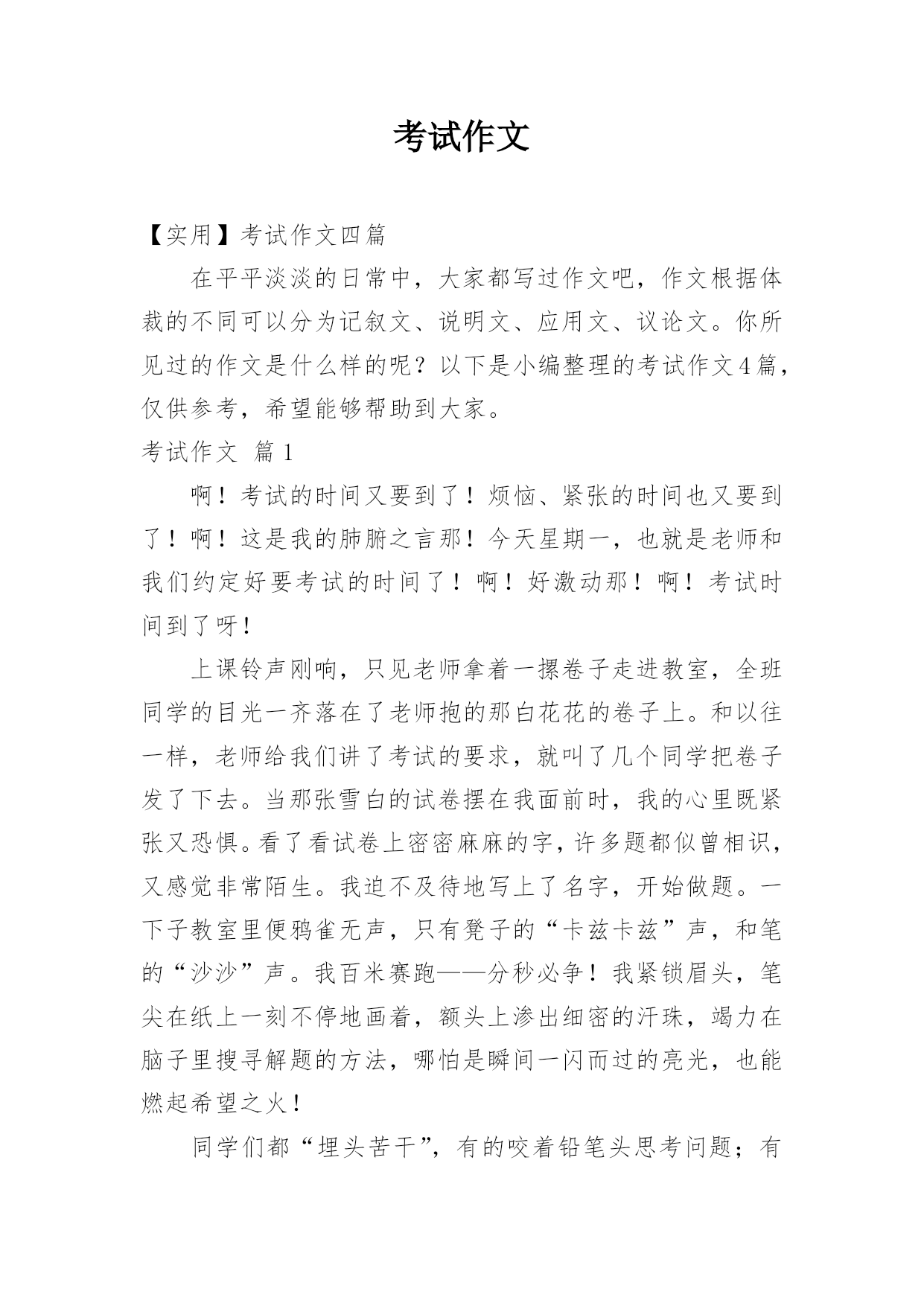 考试作文【实用】考试作文四篇在平平淡淡的日常中,大家都写过作文吧,作文根据体裁的不同可以分为记叙文、说明文、应用文、议论文。你所见过的作文是什么样的呢?以下是小编整理的考试作文4篇,仅供参考,希望能够帮助到大家。考试作文篇1啊!考试的时间又要到了!烦恼、紧张的时间也又要到了!啊!这是我的肺腑之言那!今天星期一,也就是老师和我们约定好要考试的时间了!啊!好激动那!啊!考试时间到了呀!上课铃声刚响,只见老师拿着一摞卷子走进教室,全班同学的目光一齐落在了老师抱的那白花花的卷子上。和以往一样,老师给我们讲了考试的