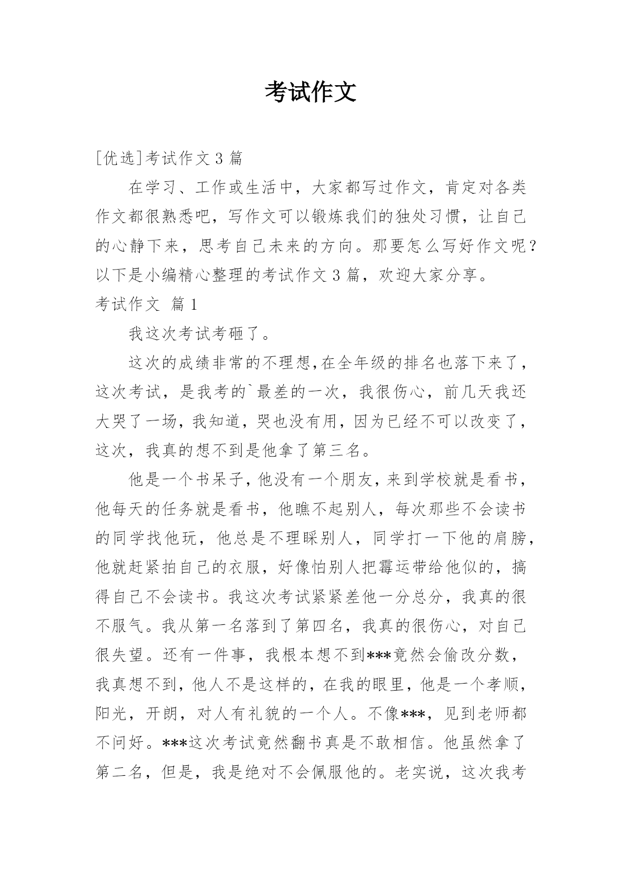 考试作文[优选]考试作文3篇在学习、工作或生活中,大家都写过作文,肯定对各类作文都很熟悉吧,写作文可以锻炼我们的独处习惯,让自己的心静下来,思考自己未来的方向。那要怎么写好作文呢?以下是小编精心整理的考试作文3篇,欢迎大家分享。考试作文篇1我这次考试考砸了。这次的成绩非常的不理想,在全年级的排名也落下来了,这次考试,是我考的`最差的一次,我很伤心,前几天我还大哭了一场,我知道,哭也没有用,因为已经不可以改变了,这次,我真的想不到是他拿了第三名。他是一个书呆子,他没有一个朋友,来到学校就是看书,他每天的任务