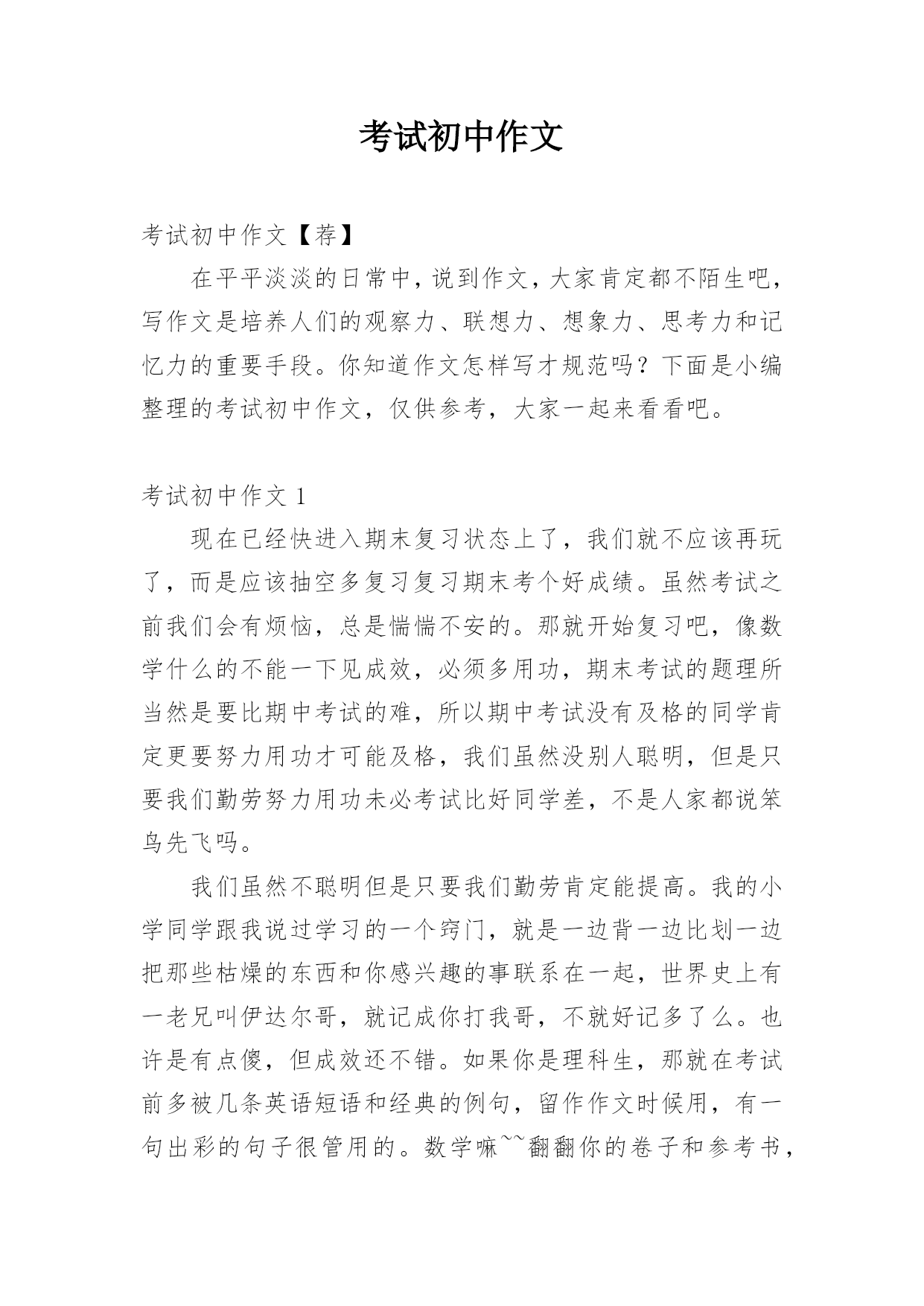 考试初中作文考试初中作文【荐】在平平淡淡的日常中,说到作文,大家肯定都不陌生吧,写作文是培养人们的观察力、联想力、想象力、思考力和记忆力的重要手段。你知道作文怎样写才规范吗?下面是小编整理的考试初中作文,仅供参考,大家一起来看看吧。考试初中作文1现在已经快进入期末复习状态上了,我们就不应该再玩了,而是应该抽空多复习复习期末考个好成绩。虽然考试之前我们会有烦恼,总是惴惴不安的。那就开始复习吧,像数学什么的不能一下见成效,必须多用功,期末考试的题理所当然是要比期中考试的难,所以期中考试没有及格的同学肯定更要努