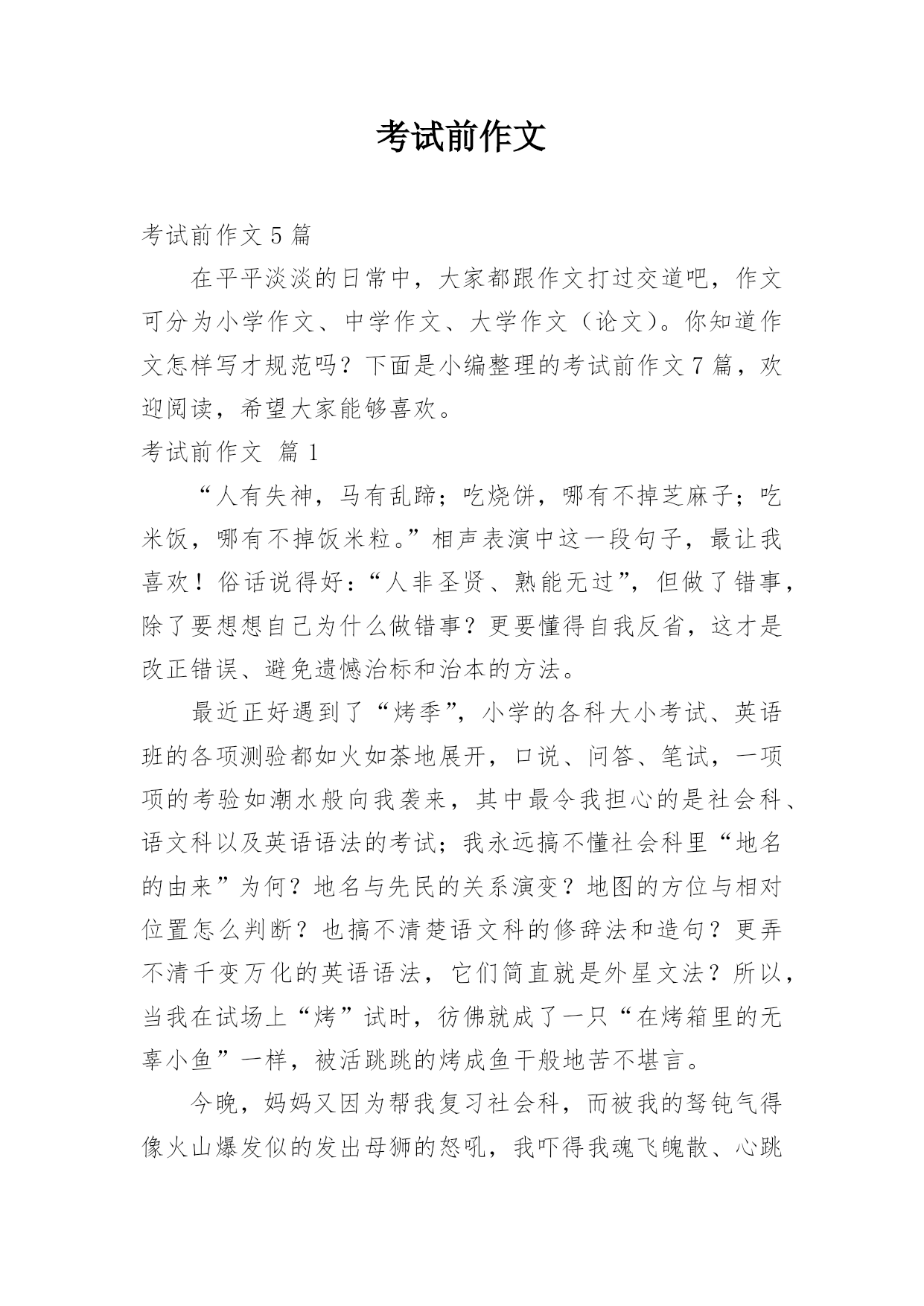 考试前作文考试前作文5篇在平平淡淡的日常中,大家都跟作文打过交道吧,作文可分为小学作文、中学作文、大学作文(论文)。你知道作文怎样写才规范吗?下面是小编整理的考试前作文7篇,欢迎阅读,希望大家能够喜欢。考试前作文篇1“人有失神,马有乱蹄;吃烧饼,哪有不掉芝麻子;吃米饭,哪有不掉饭米粒。”相声表演中这一段句子,最让我喜欢!俗话说得好:“人非圣贤、熟能无过”,但做了错事,除了要想想自己为什么做错事?更要懂得自我反省,这才是改正错误、避免遗憾治标和治本的方法。最近正好遇到了“烤季”,小学的各科大小考试、英语班的