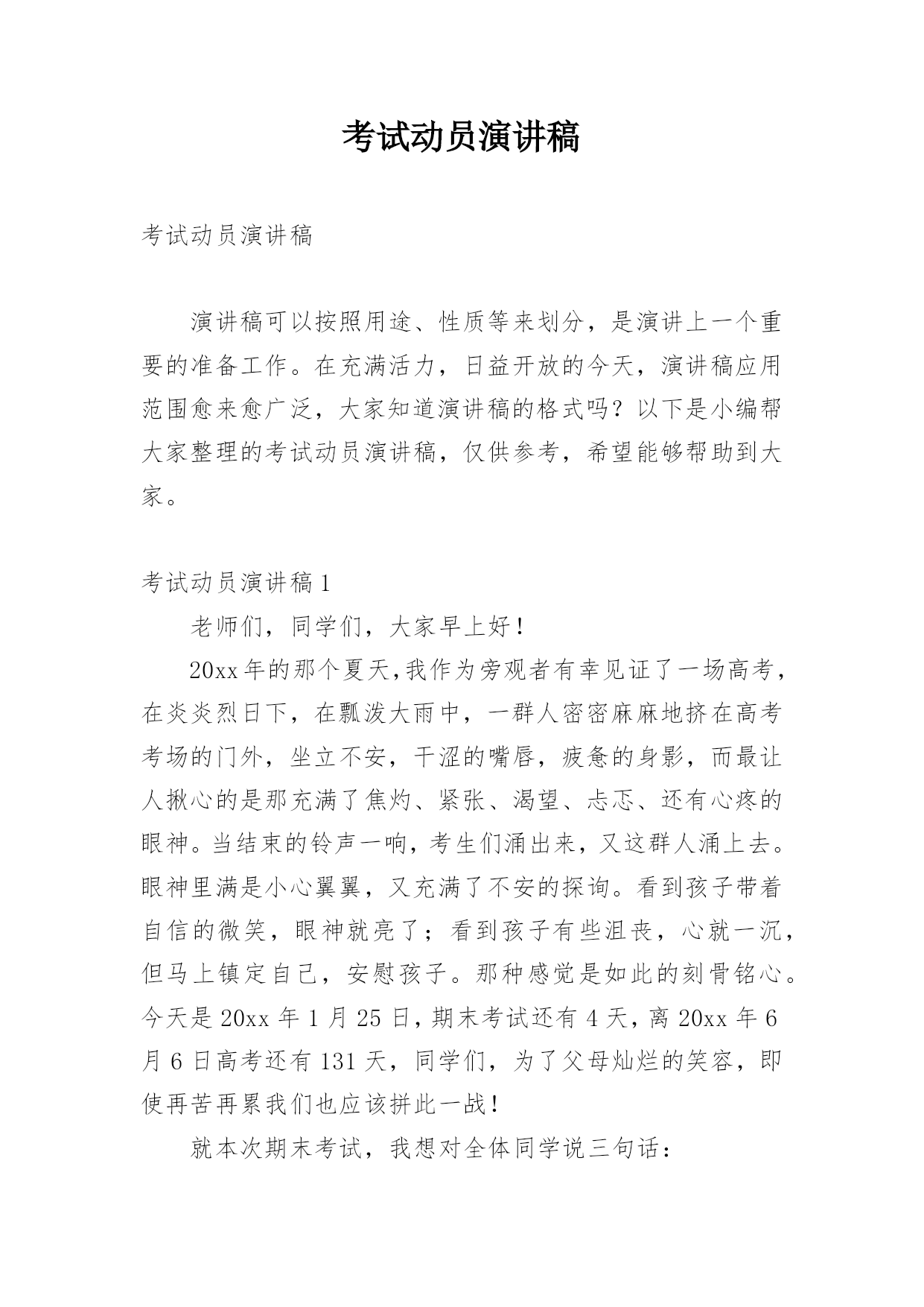 考试动员演讲稿考试动员演讲稿演讲稿可以按照用途、性质等来划分,是演讲上一个重要的准备工作。在充满活力,日益开放的今天,演讲稿应用范围愈来愈广泛,大家知道演讲稿的格式吗?以下是小编帮大家整理的考试动员演讲稿,仅供参考,希望能够帮助到大家。考试动员演讲稿1老师们,同学们,大家早上好!20xx年的那个夏天,我作为旁观者有幸见证了一场高考,在炎炎烈日下,在瓢泼大雨中,一群人密密麻麻地挤在高考考场的门外,坐立不安,干涩的嘴唇,疲惫的身影,而最让人揪心的是那充满了焦灼、紧张、渴望、忐忑、还有心疼的眼神。当结束的铃声一