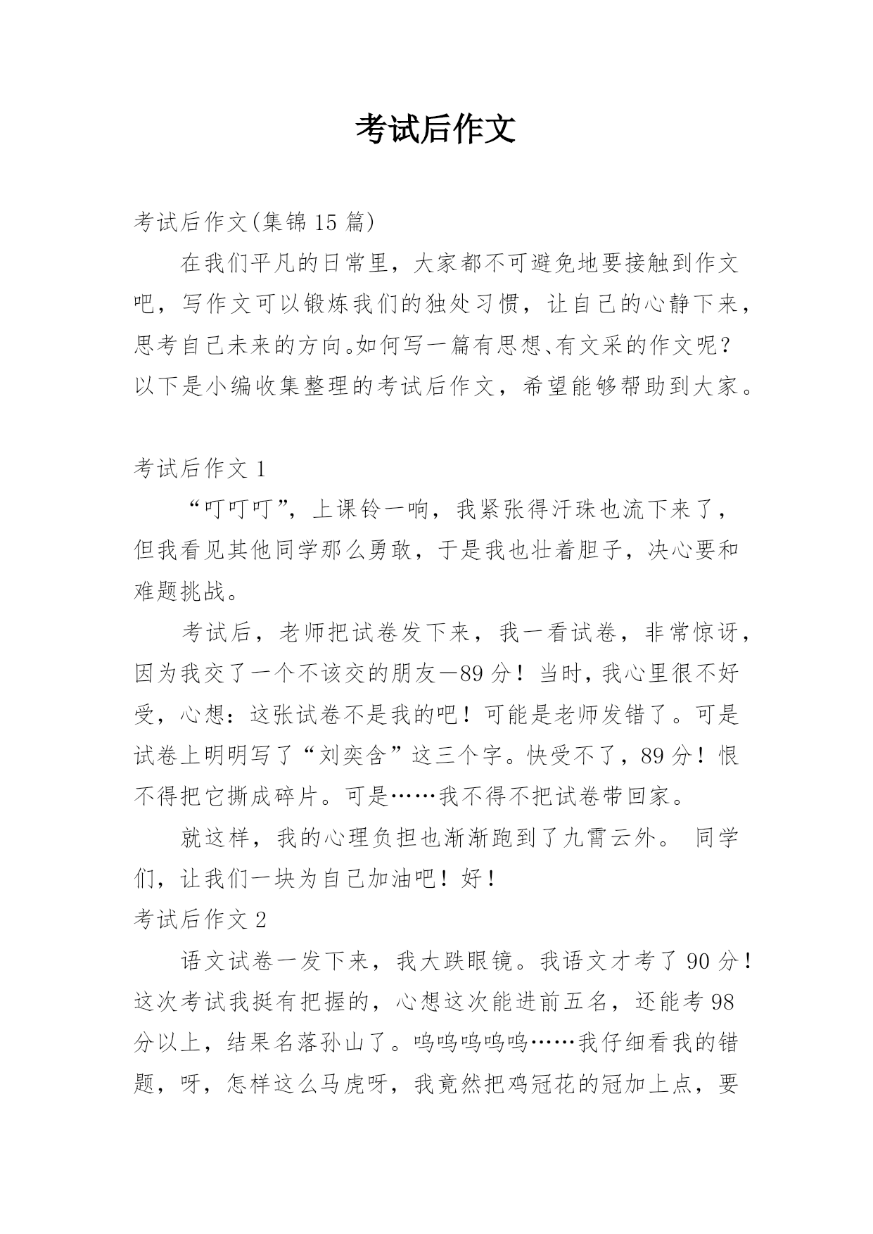 考试后作文考试后作文(集锦15篇)在我们平凡的日常里,大家都不可避免地要接触到作文吧,写作文可以锻炼我们的独处习惯,让自己的心静下来,思考自己未来的方向。如何写一篇有思想、有文采的作文呢?以下是小编收集整理的考试后作文,希望能够帮助到大家。考试后作文1“叮叮叮”,上课铃一响,我紧张得汗珠也流下来了,但我看见其他同学那么勇敢,于是我也壮着胆子,决心要和难题挑战。考试后,老师把试卷发下来,我一看试卷,非常惊讶,因为我交了一个不该交的朋友―89分!当时,我心里很不好受,心想:这张试卷不是我的吧!可能是老师发错了