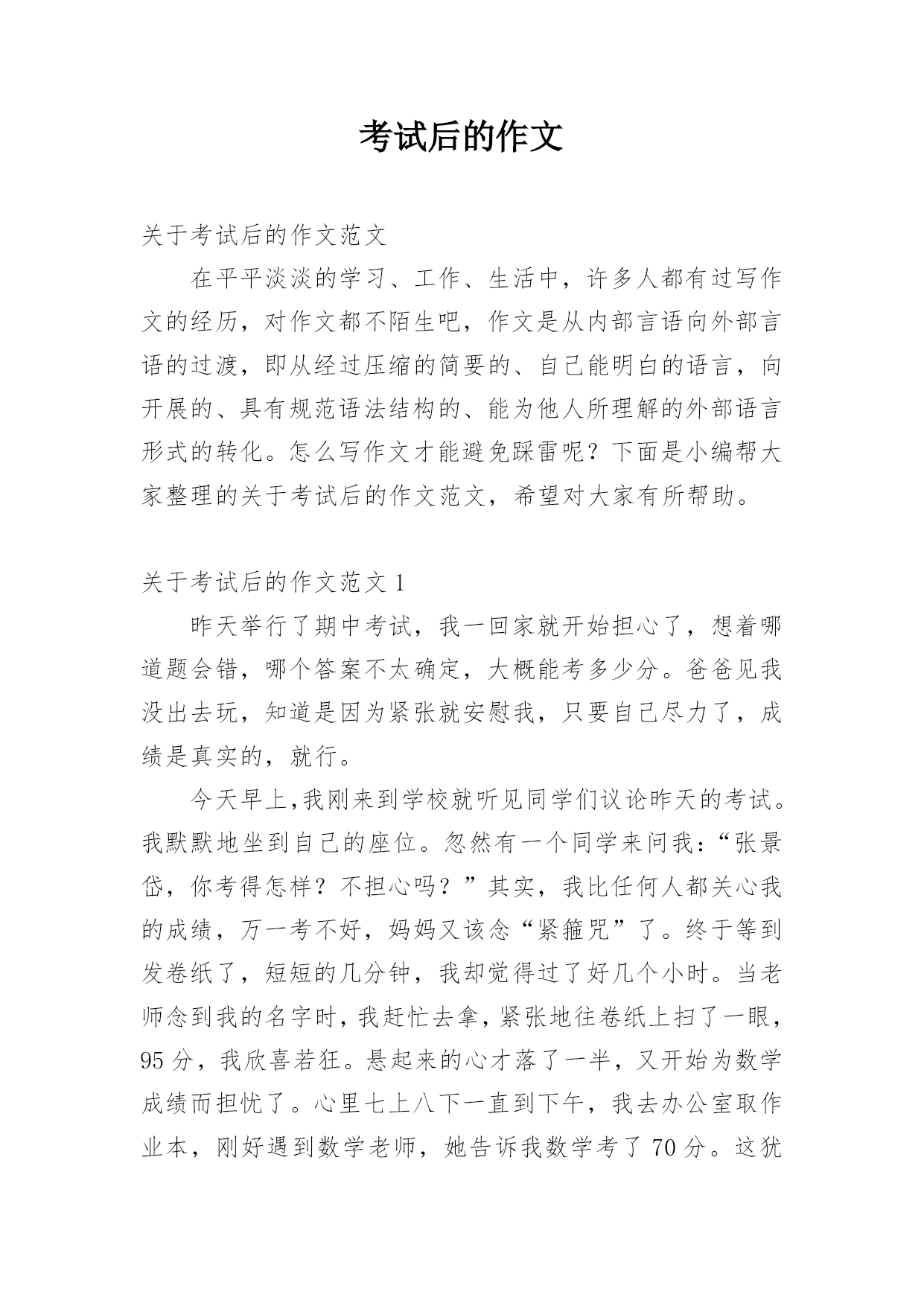 考试后的作文关于考试后的作文范文在平平淡淡的学习、工作、生活中,许多人都有过写作文的经历,对作文都不陌生吧,作文是从内部言语向外部言语的过渡,即从经过压缩的简要的、自己能明白的语言,向开展的、具有规范语法结构的、能为他人所理解的外部语言形式的转化。怎么写作文才能避免踩雷呢?下面是小编帮大家整理的关于考试后的作文范文,希望对大家有所帮助。关于考试后的作文范文1昨天举行了期中考试,我一回家就开始担心了,想着哪道题会错,哪个答案不太确定,大概能考多少分。爸爸见我没出去玩,知道是因为紧张就安慰我,只要自己尽力了,