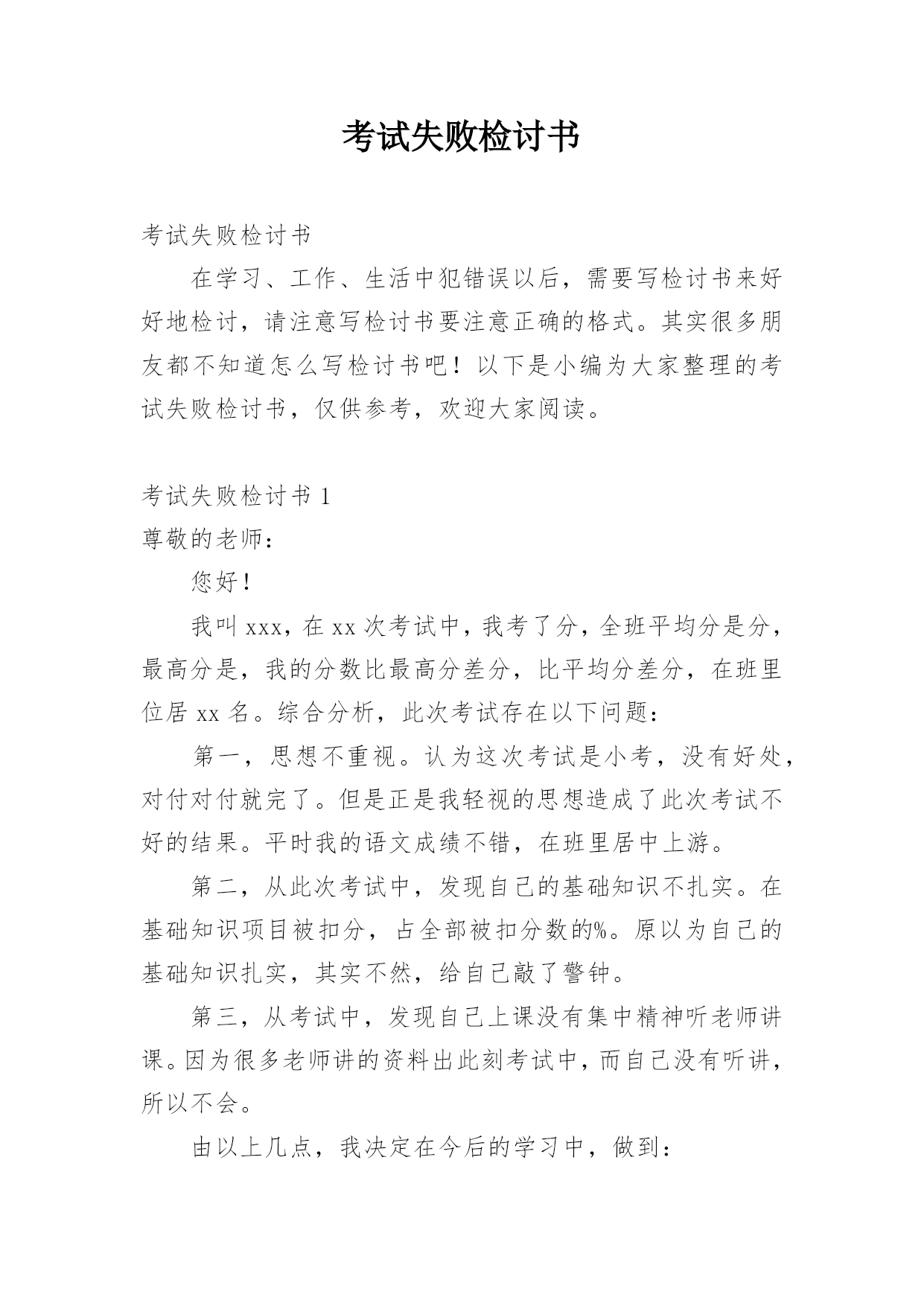 考试失败检讨书考试失败检讨书在学习、工作、生活中犯错误以后,需要写检讨书来好好地检讨,请注意写检讨书要注意正确的格式。其实很多朋友都不知道怎么写检讨书吧!以下是小编为大家整理的考试失败检讨书,仅供参考,欢迎大家阅读。考试失败检讨书1尊敬的老师:您好!我叫xxx,在xx次考试中,我考了分,全班平均分是分,最高分是,我的分数比最高分差分,比平均分差分,在班里位居xx名。综合分析,此次考试存在以下问题:第一,思想不重视。认为这次考试是小考,没有好处,对付对付就完了。但是正是我轻视的思想造成了此次考试不好的结果。